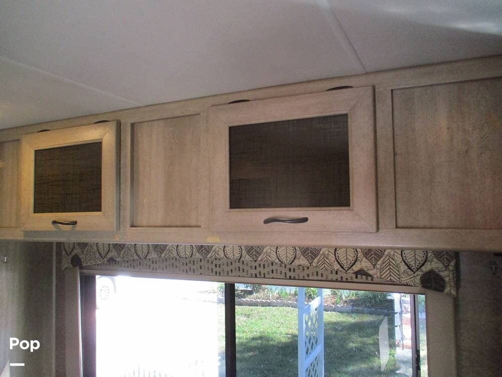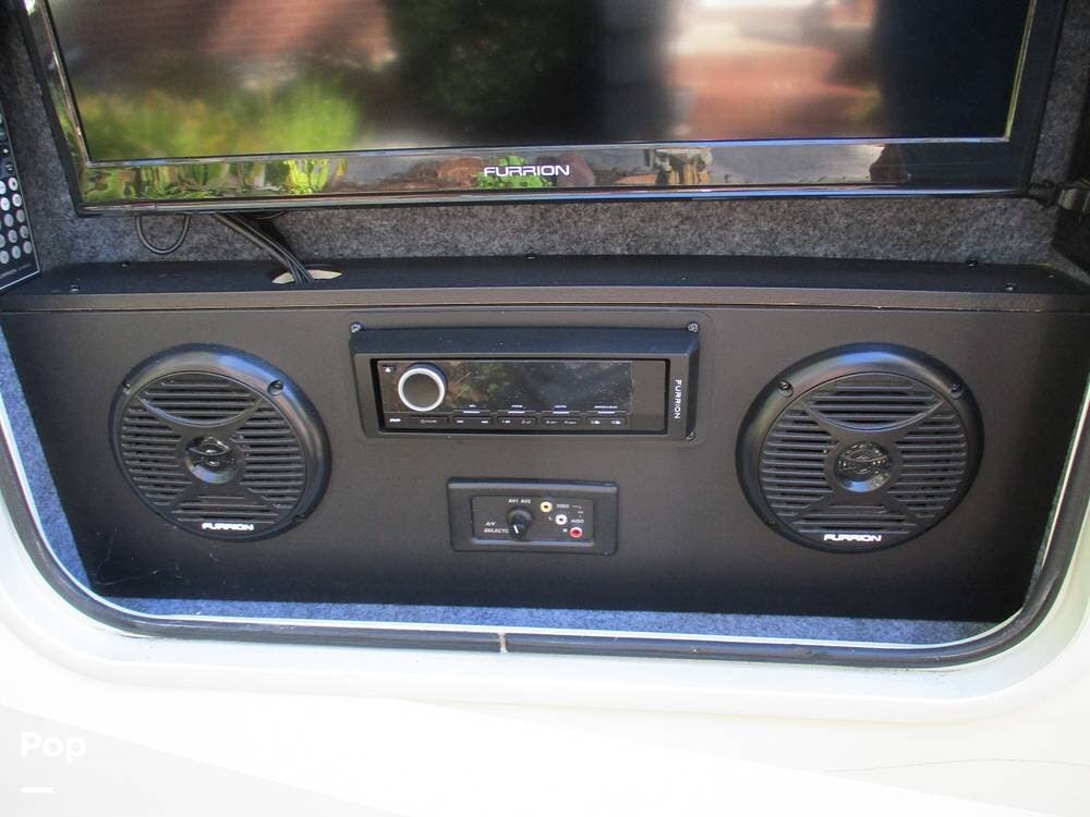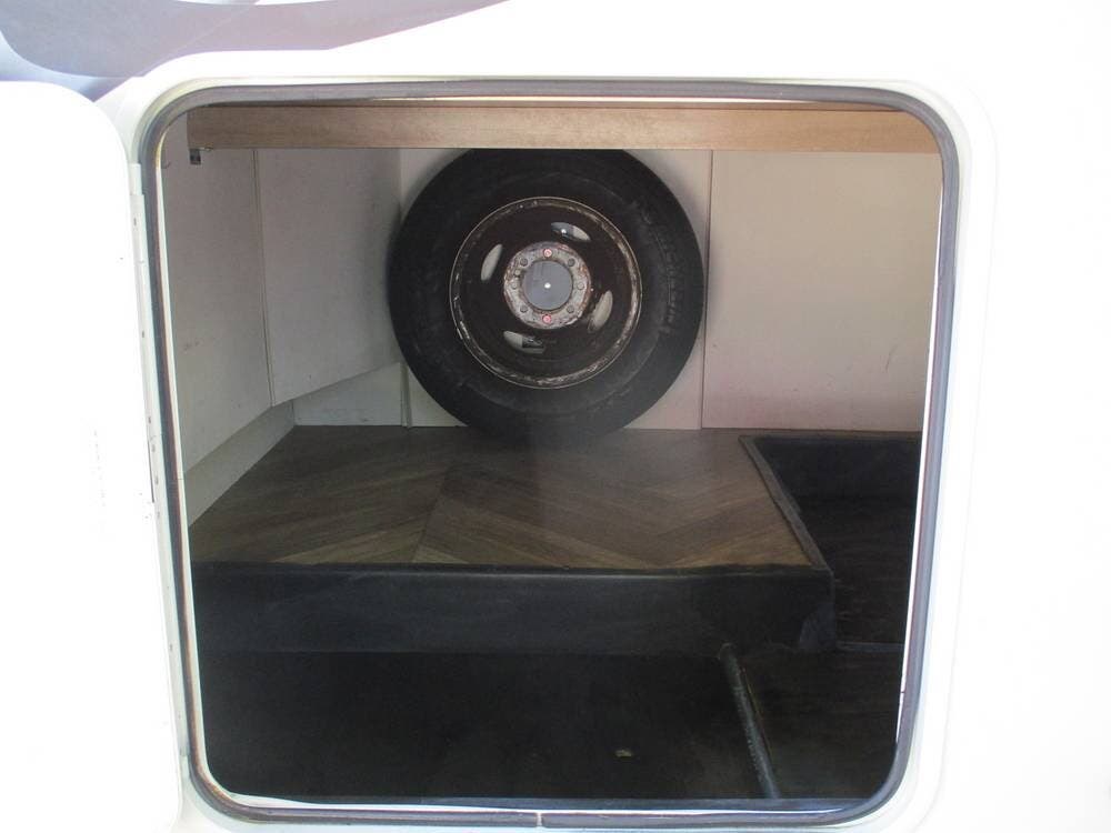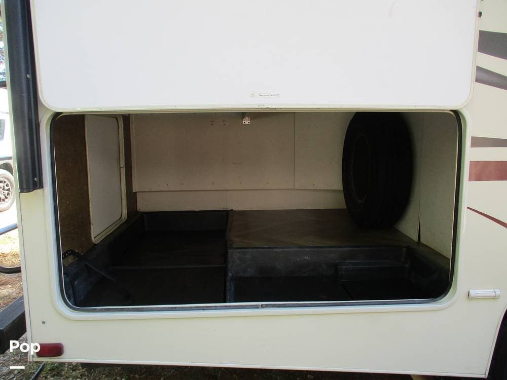 On the exterior, you can relax under the large patio awning and enjoy the Exterior TV and Stereo. There is a very large storage compartment to the rear of the RV.