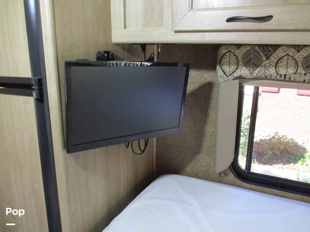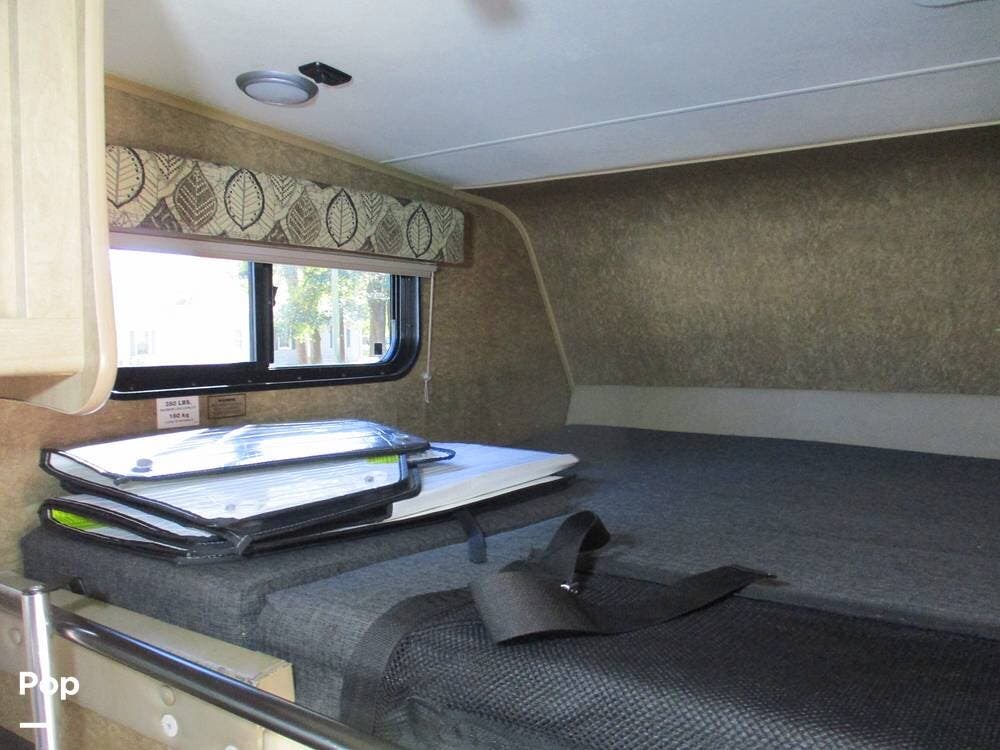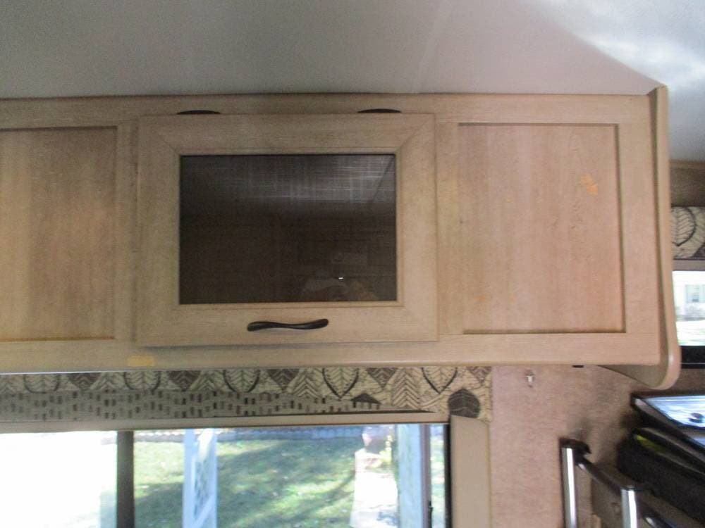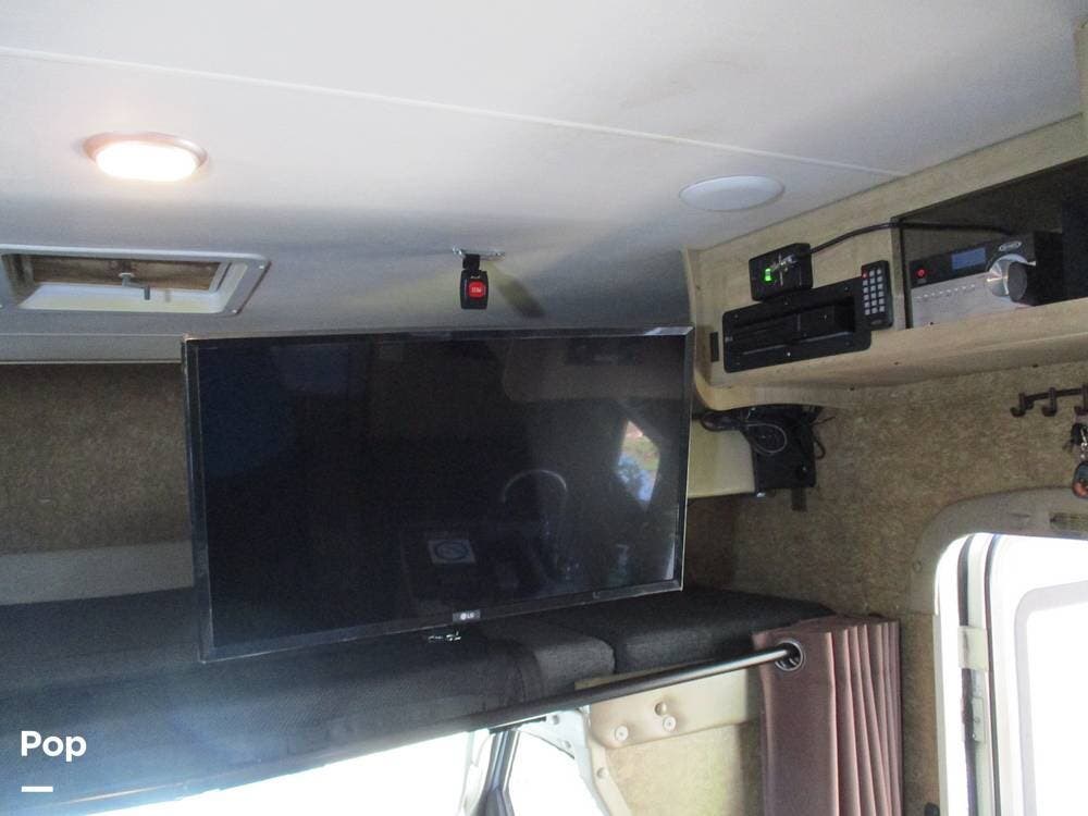 There is also an over-cab bunk for additional sleeping or storage. The TV is on a swing arm, so it can be enjoyed in the bunk area or the main living area.
