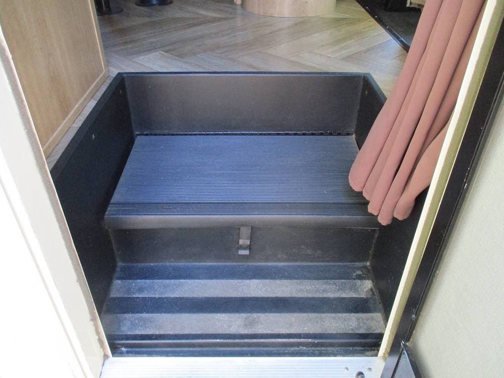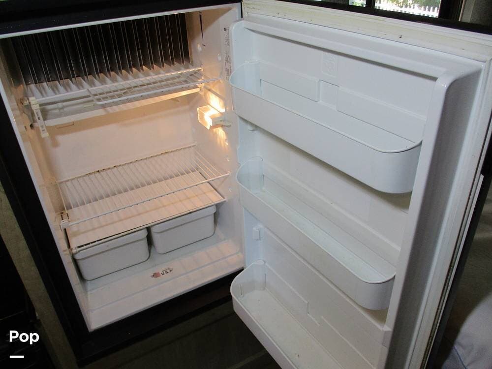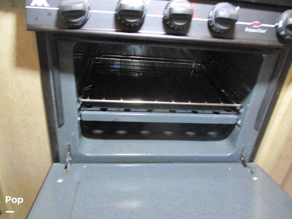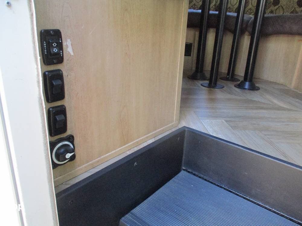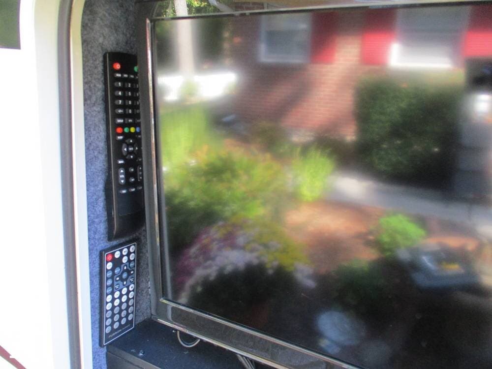 There is also an over-cab bunk for additional sleeping or storage. The TV is on a swing arm, so it can be enjoyed in the bunk area or the main living area.