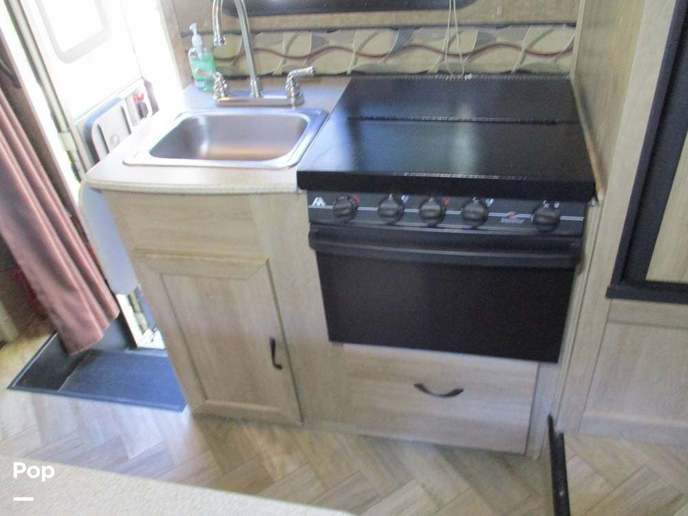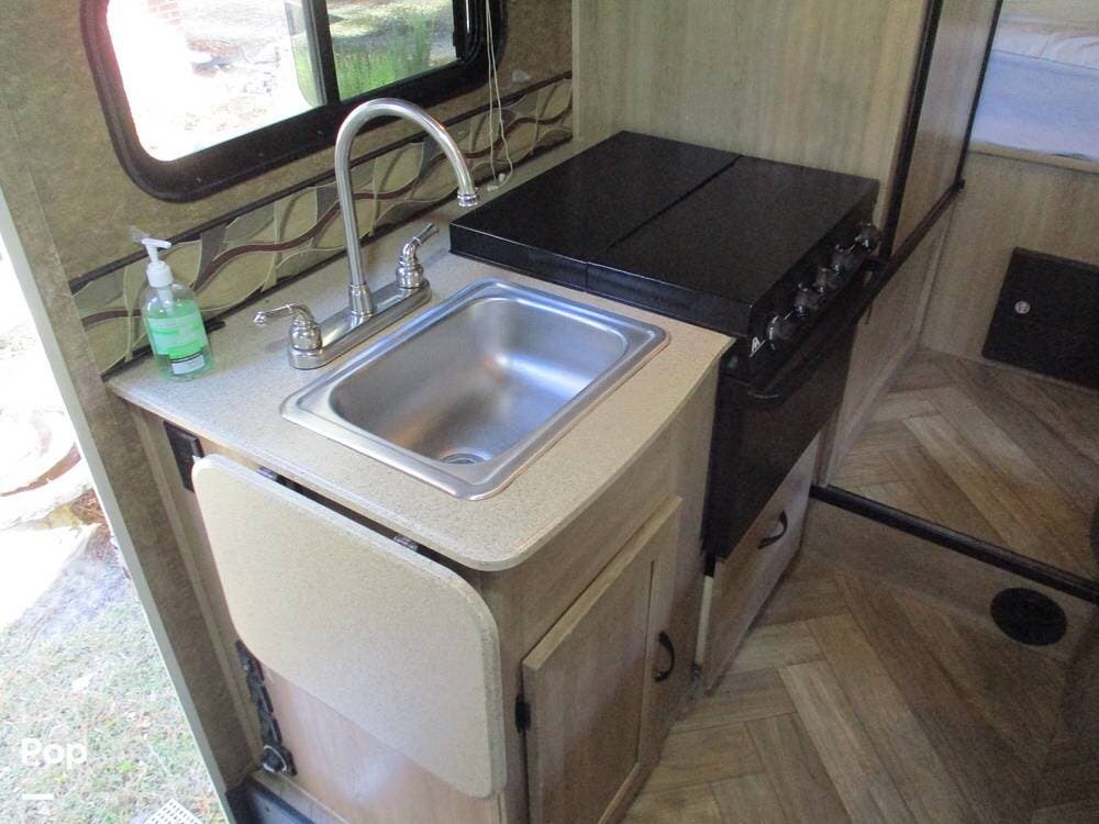 The fully equipped kitchen includes a sink with a flip-up counter extension to the side. There is a stove, oven, microwave, and refrigerator/freezer.