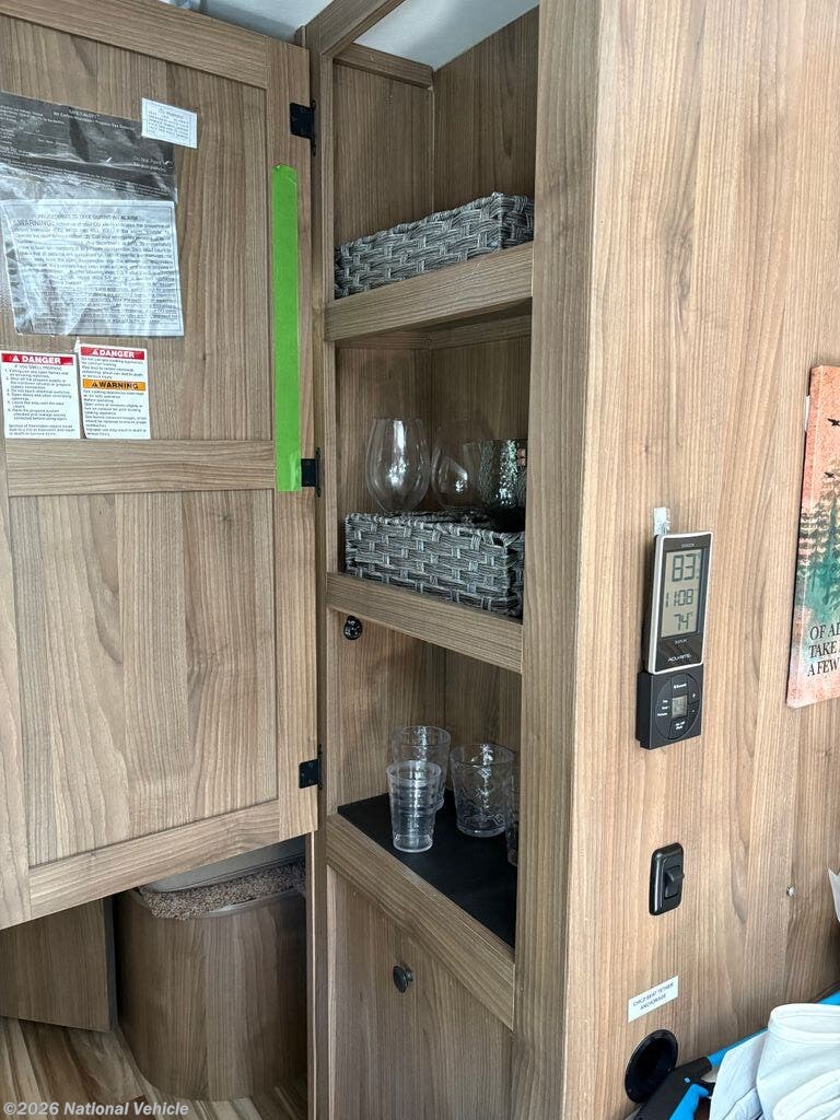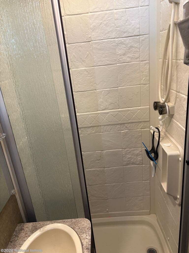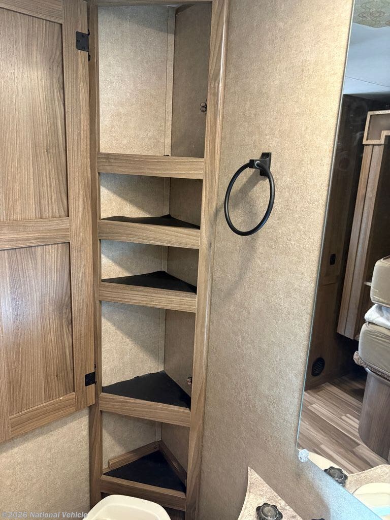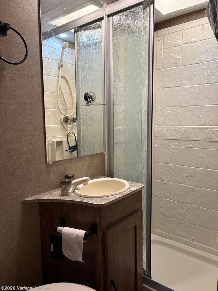 The bathroom includes a shower, toilet, and vanity, providing all the essentials of home in a compact and efficient design. Thoughtful storage throughout the coach ensures you have room for all your travel essentials without feeling cramped.