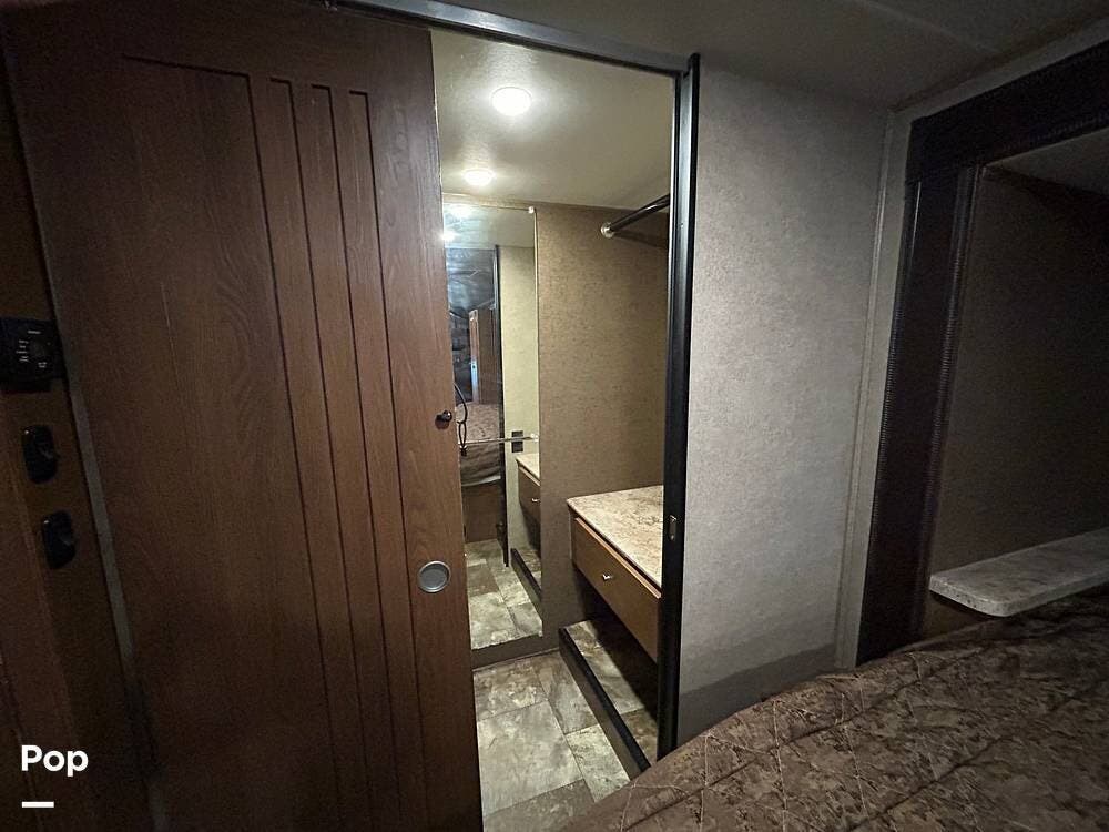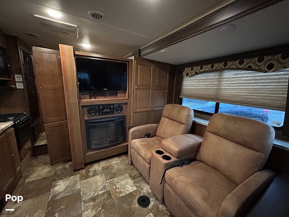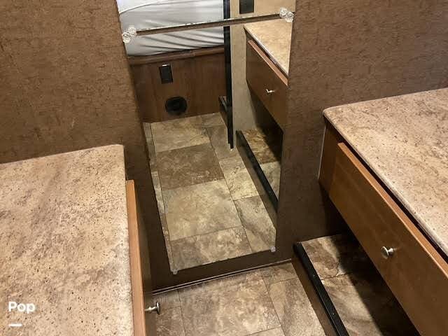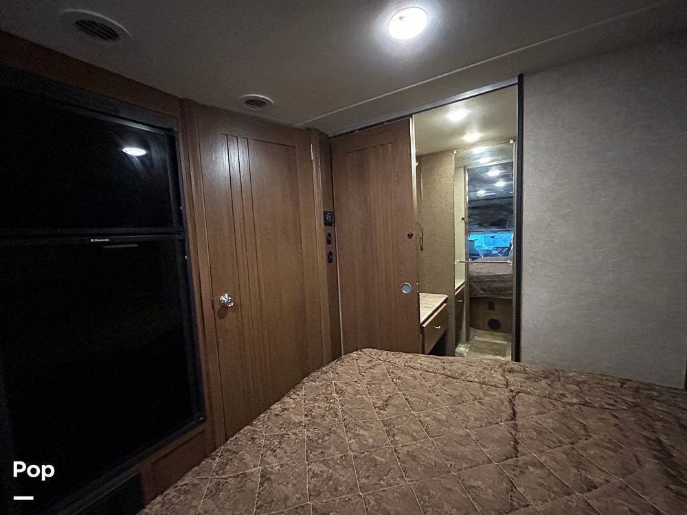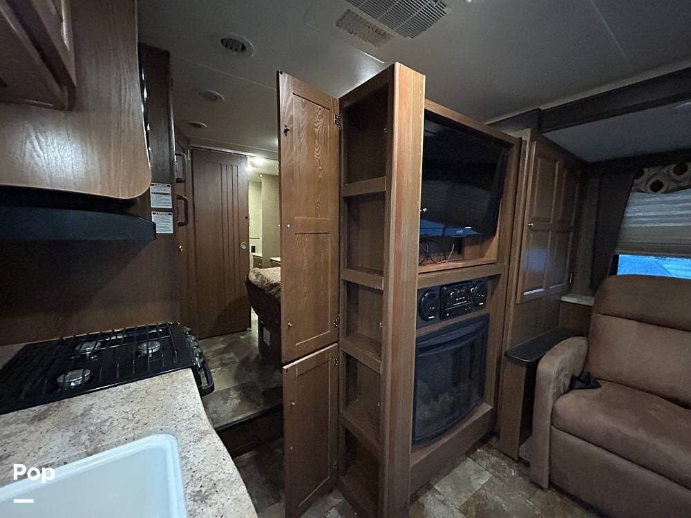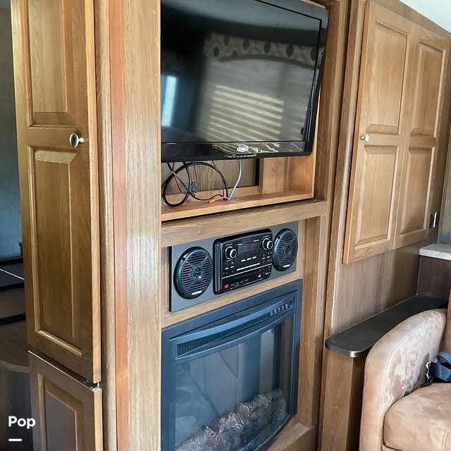 Entertainment brings a 32-inch interior TV above the fireplace, a DVD player, an AM/FM radio, plus a 24-inch outdoor TV on the slide wall. Speakers inside and under the 14-foot awning. Solar prepped.