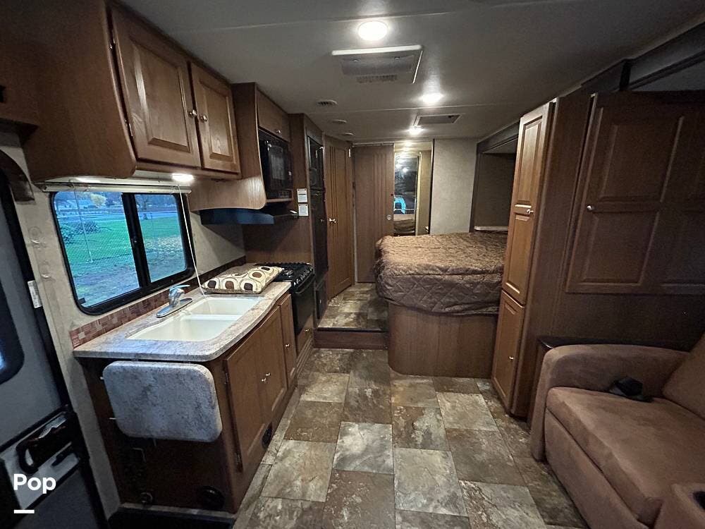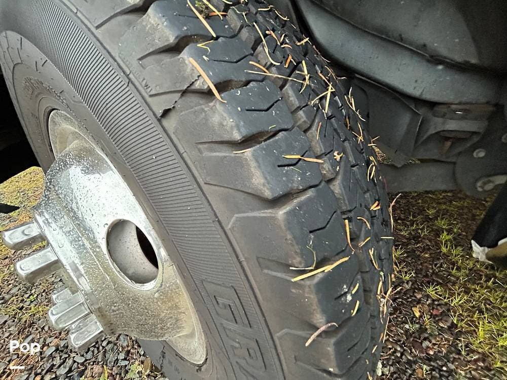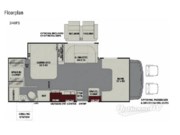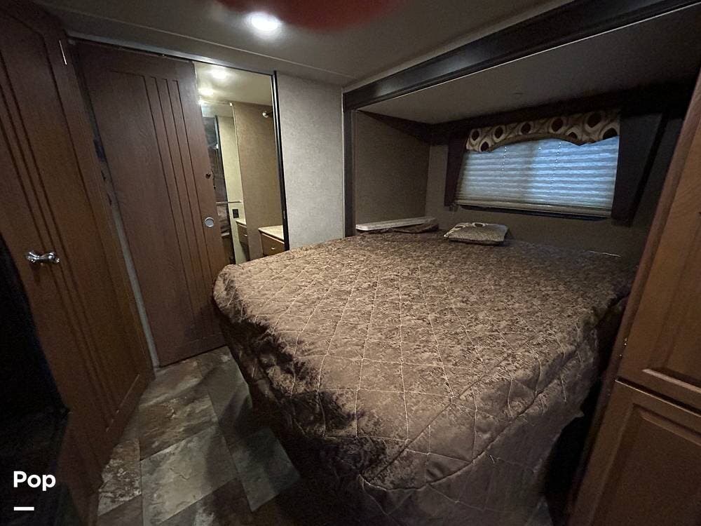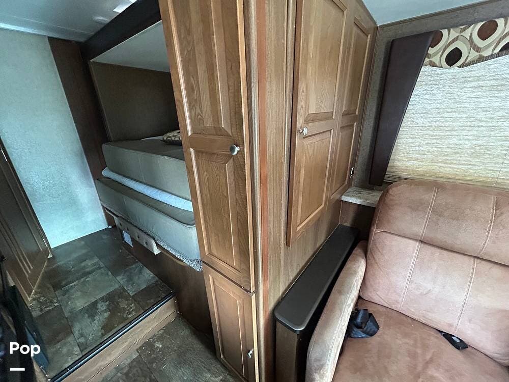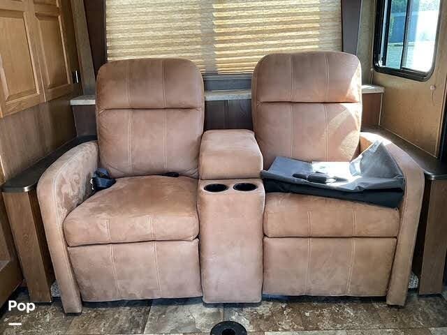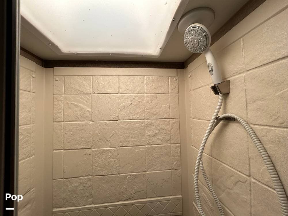 Entertainment brings a 32-inch interior TV above the fireplace, a DVD player, an AM/FM radio, plus a 24-inch outdoor TV on the slide wall. Speakers inside and under the 14-foot awning. Solar prepped.