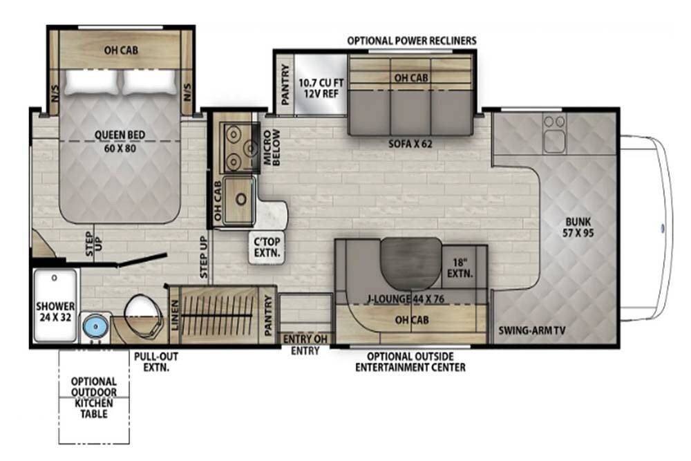 The layout is comfortable and flexible, accommodating up to 8 people. It features a bed over the cab, a sleeper sofa (jack-knife), and a J-shaped dinette that quickly converts into a fourth sleeping area if needed, along with the master bed.