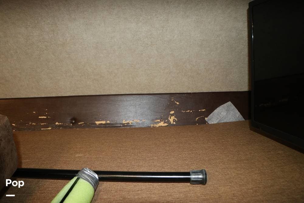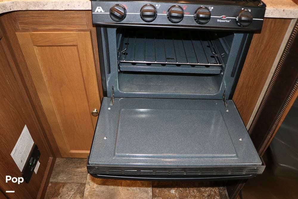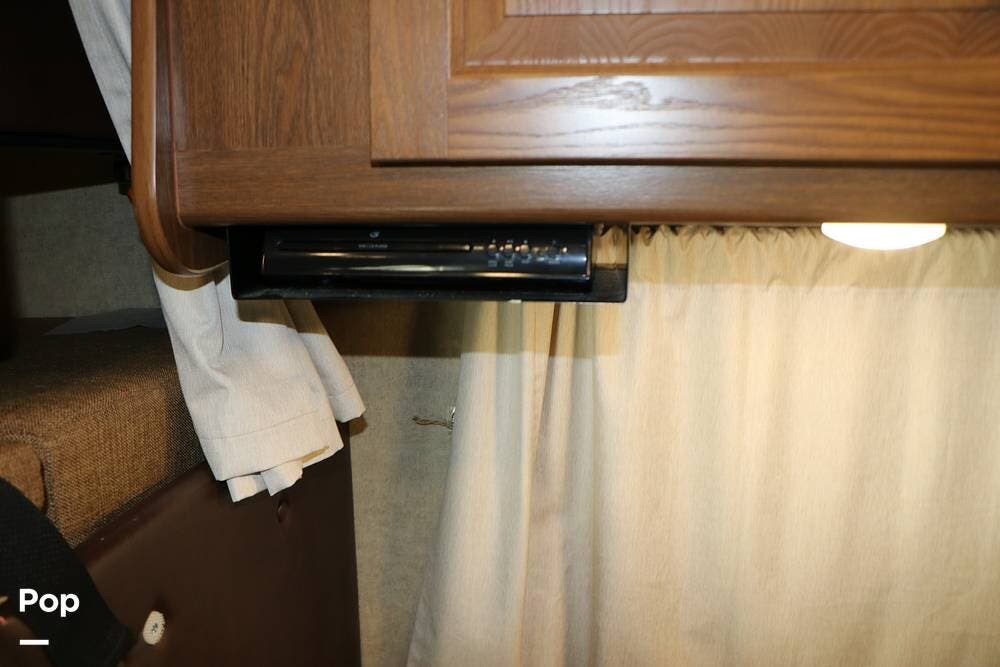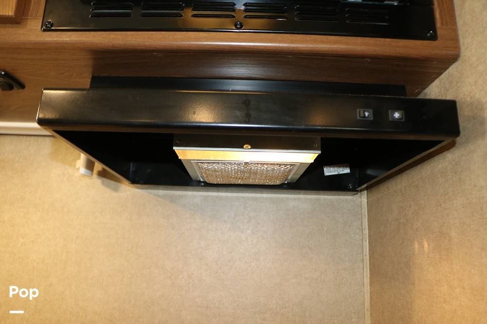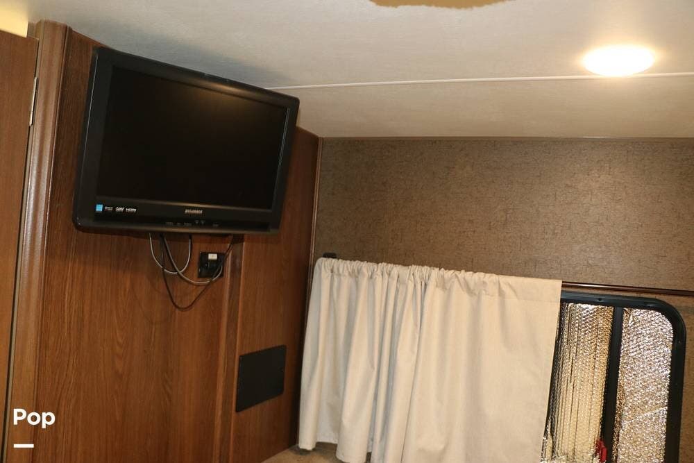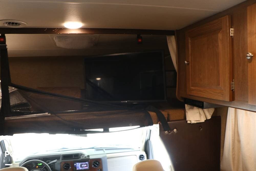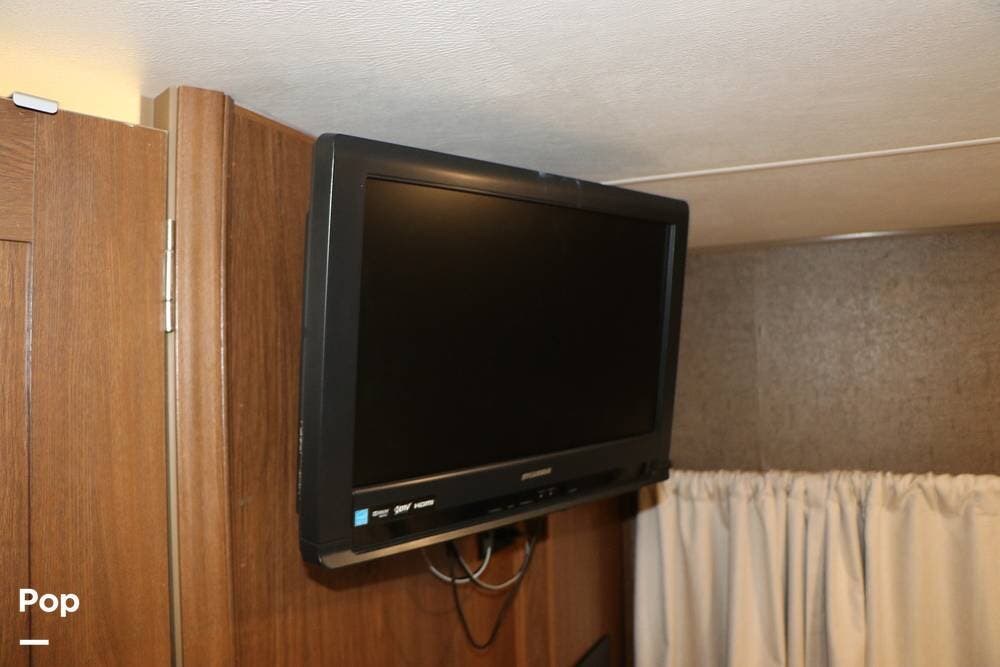The living and galley areas feature warm wood cabinetry, a TV mounted on a swing-out bracket in the overhead cab area, so you can relax at the dinette or on the sofa and enjoy your favorite show or game.