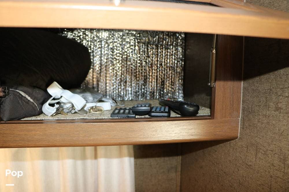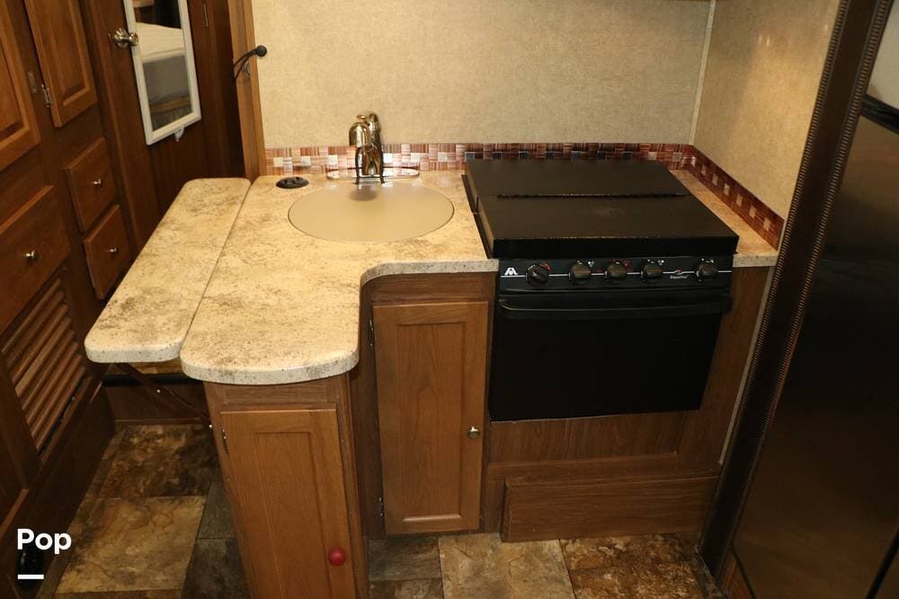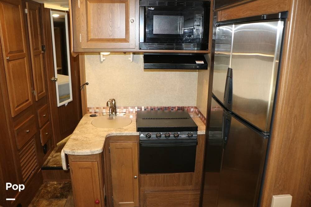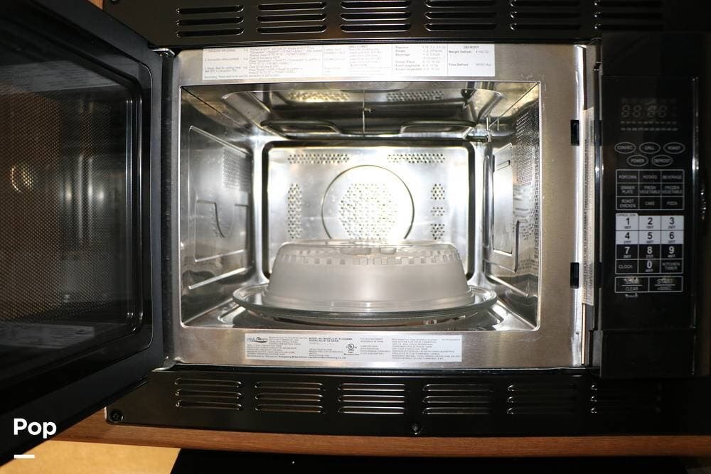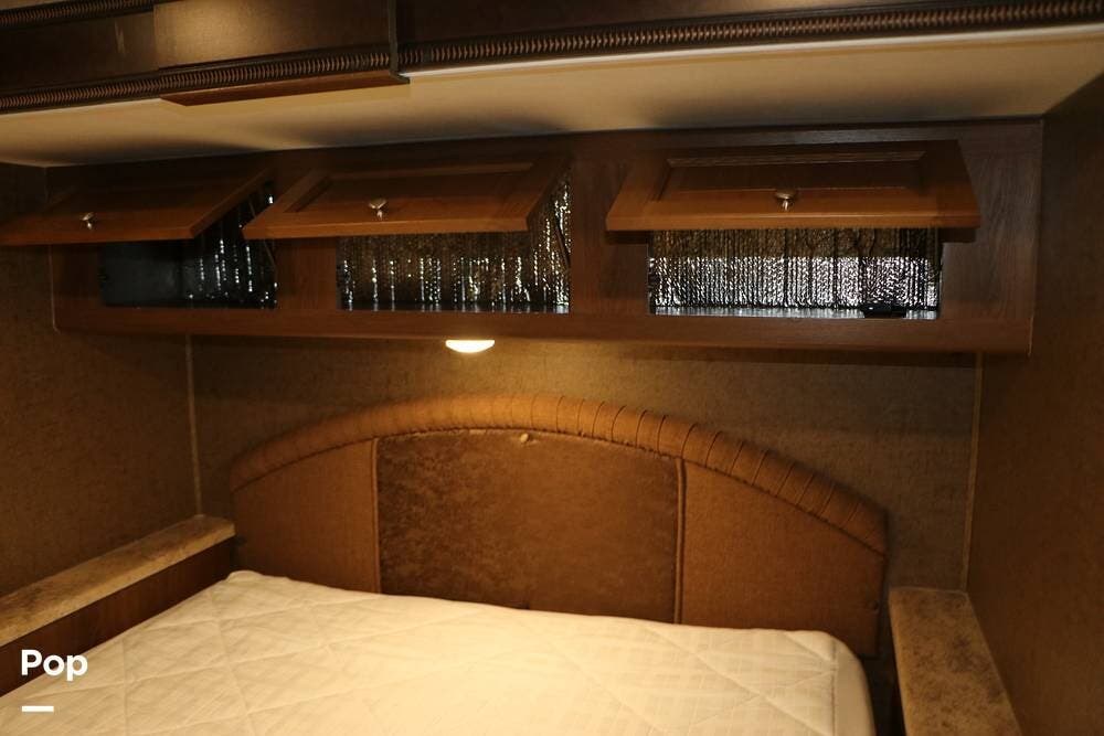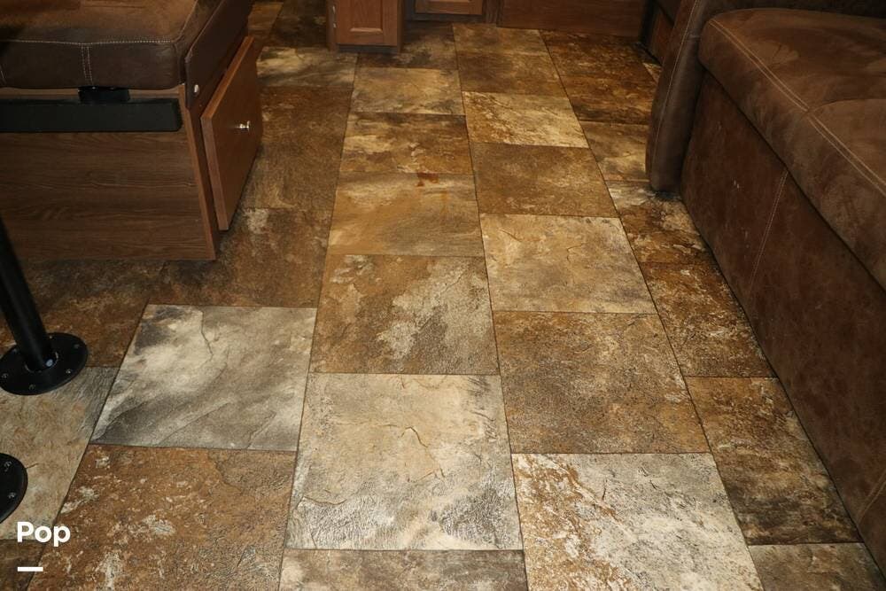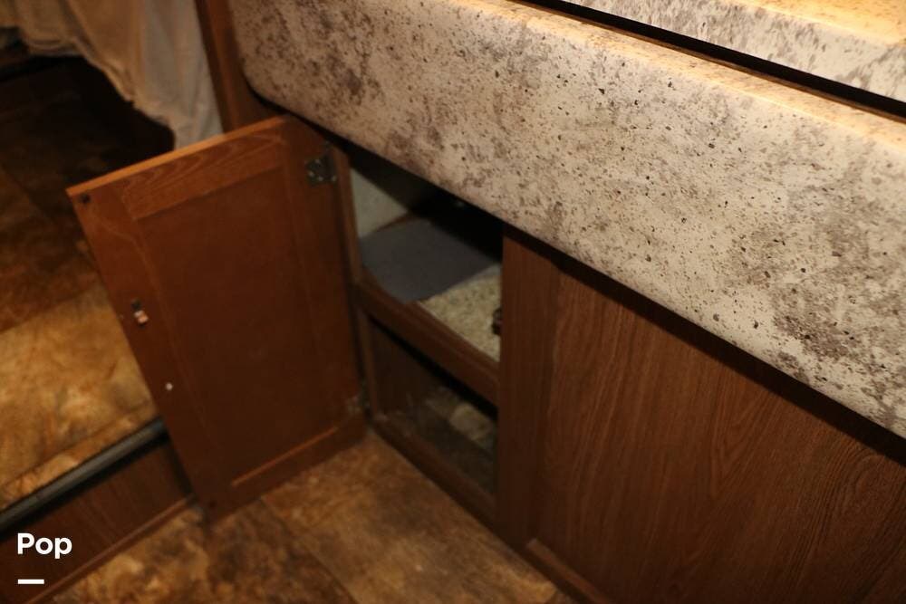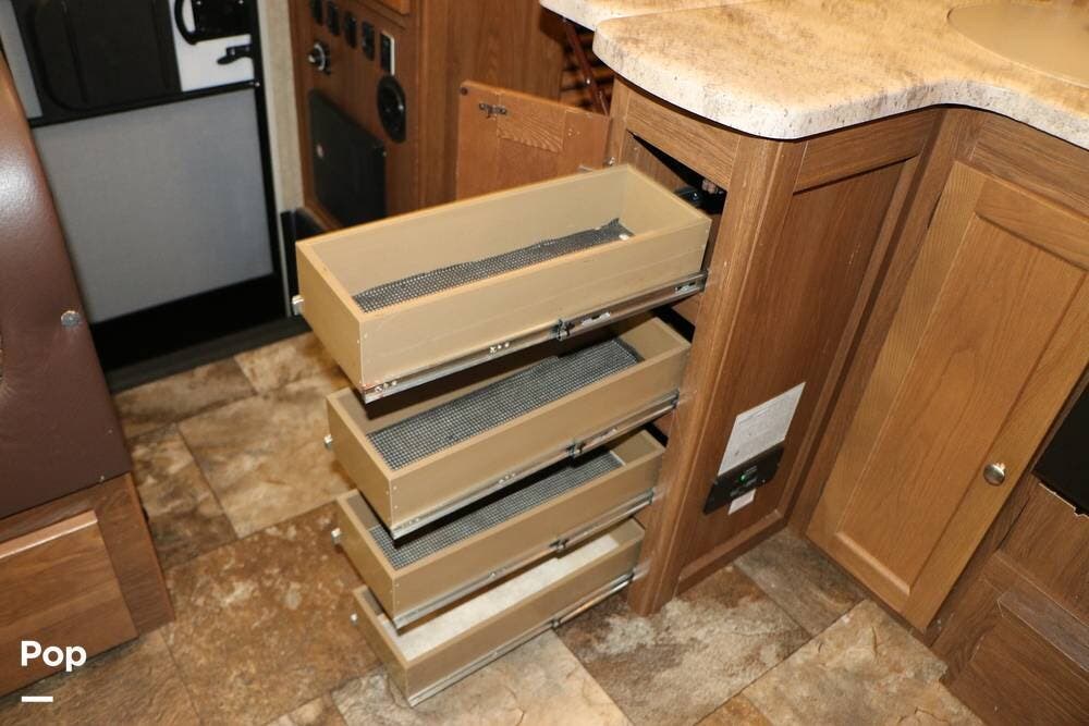 The living and galley areas feature warm wood cabinetry, a TV mounted on a swing-out bracket in the overhead cab area, so you can relax at the dinette or on the sofa and enjoy your favorite show or game.
