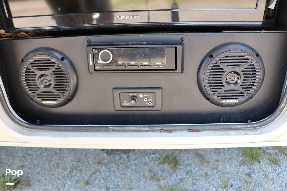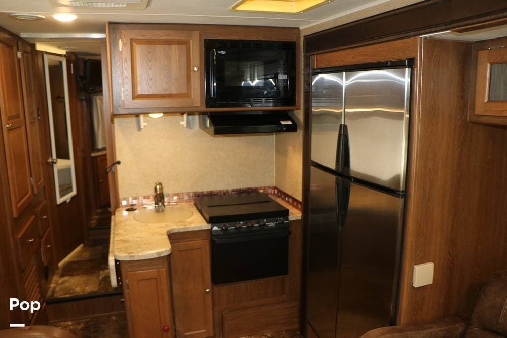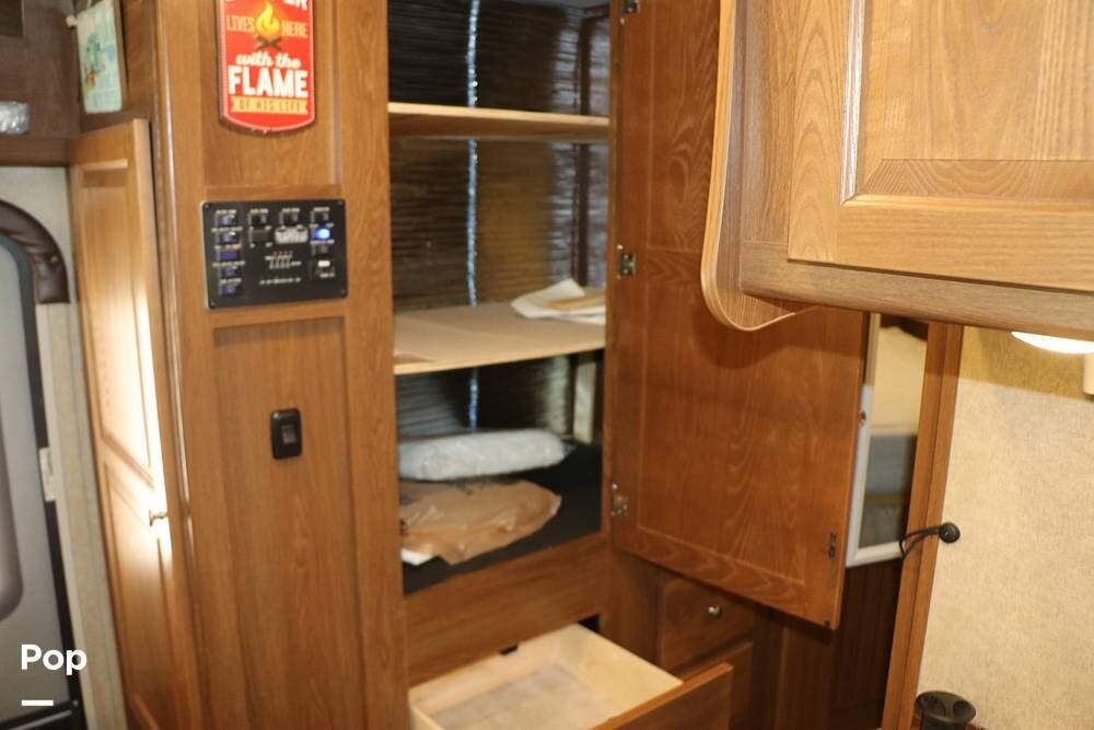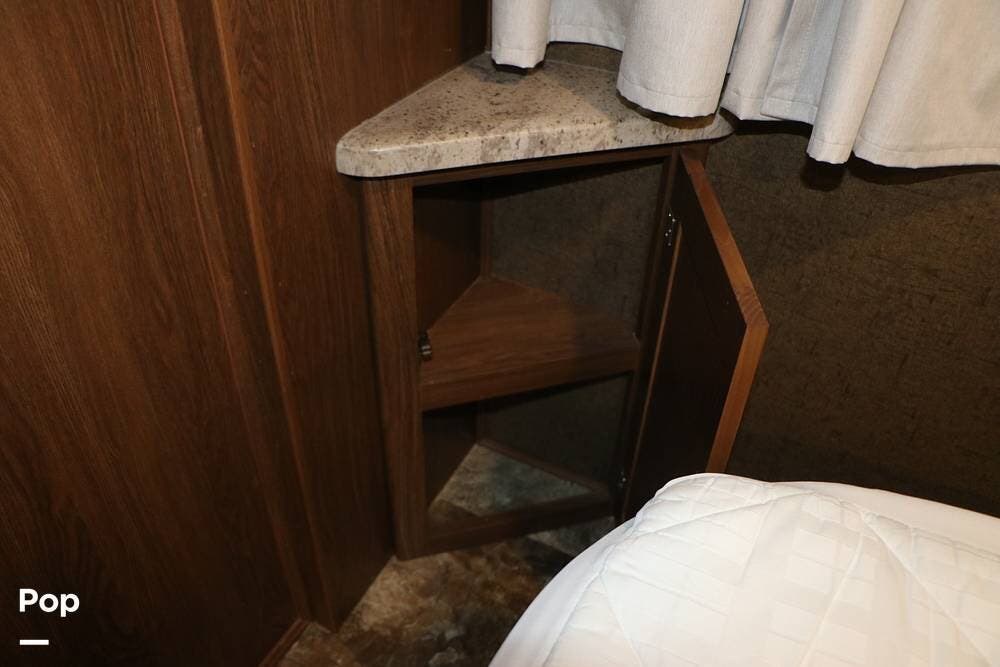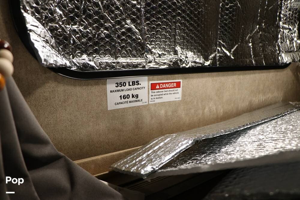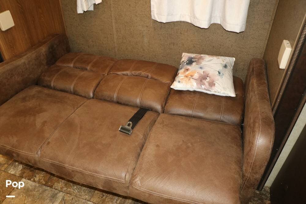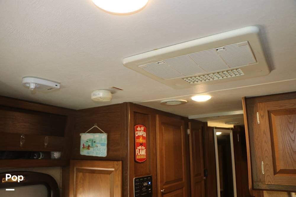 The living and galley areas feature warm wood cabinetry, a TV mounted on a swing-out bracket in the overhead cab area, so you can relax at the dinette or on the sofa and enjoy your favorite show or game.