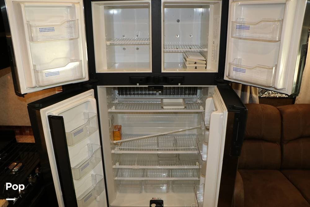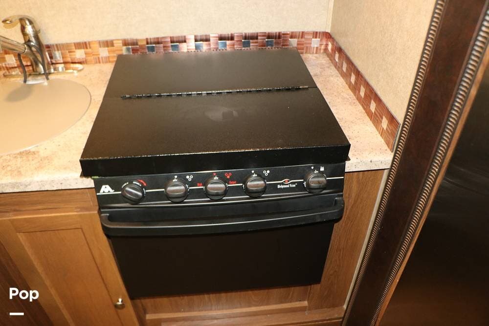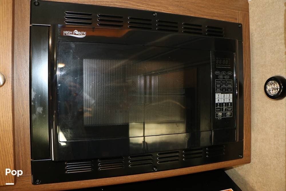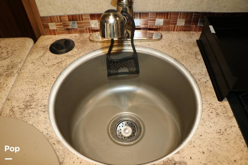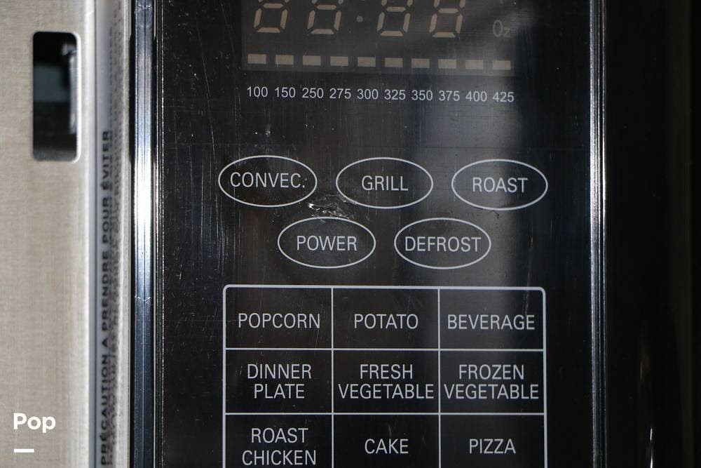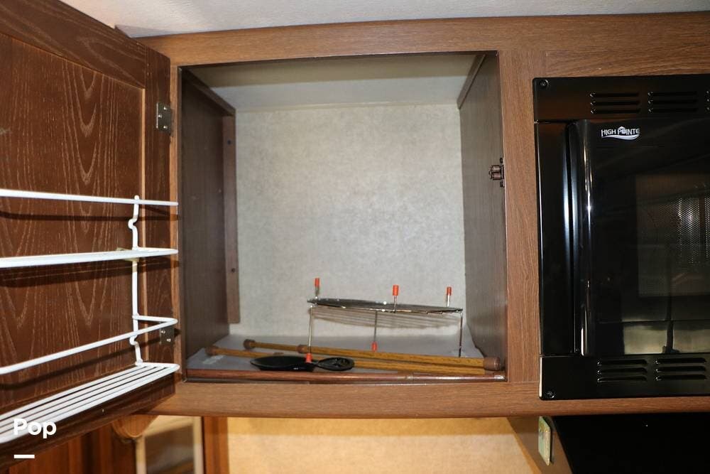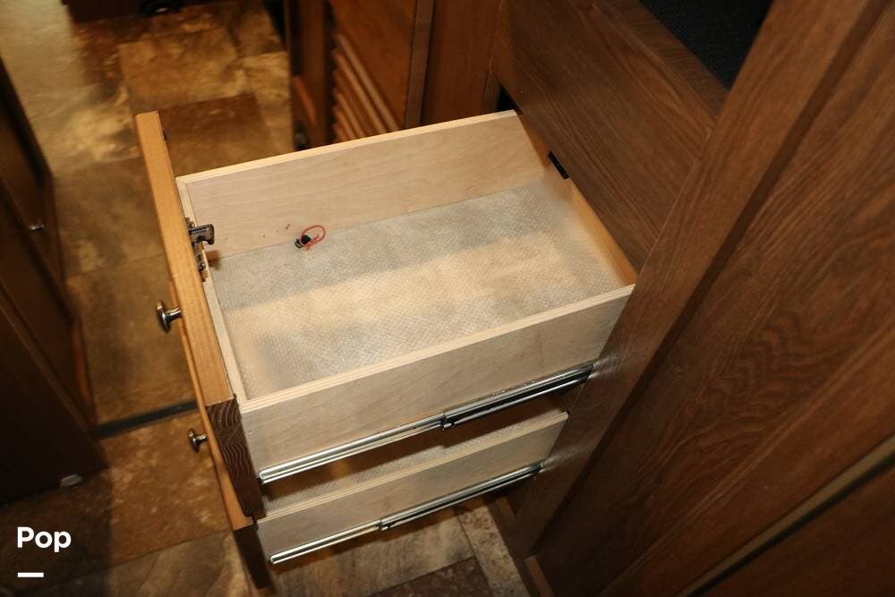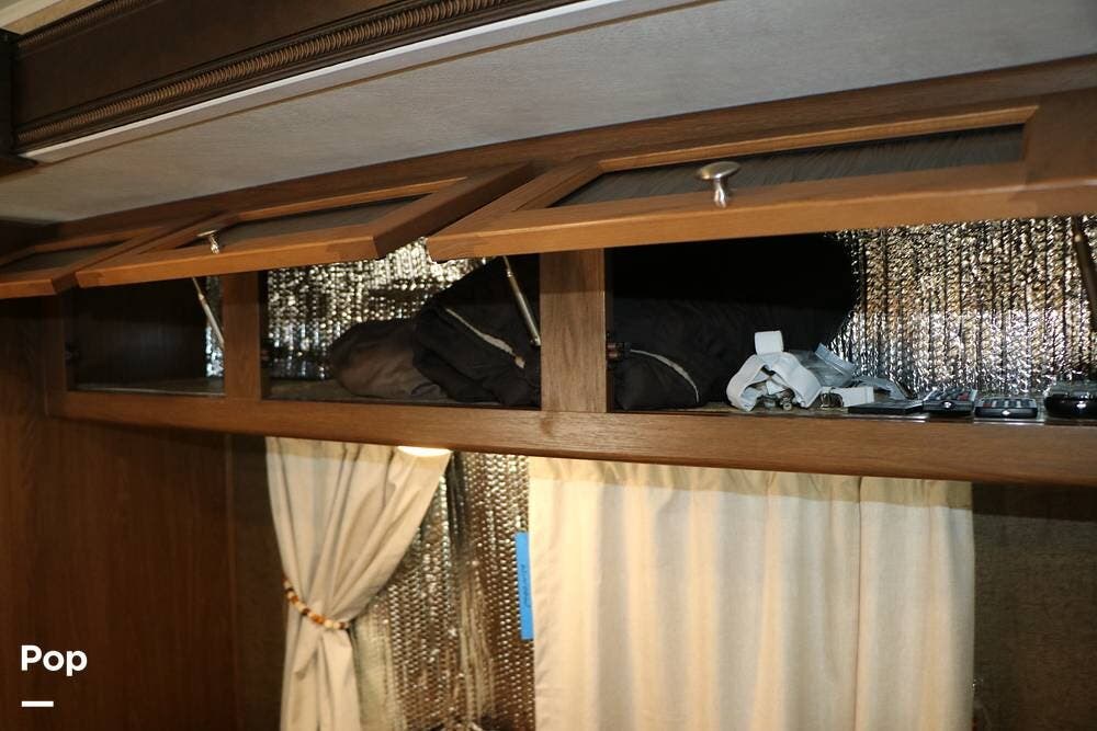 The living and galley areas feature warm wood cabinetry, a TV mounted on a swing-out bracket in the overhead cab area, so you can relax at the dinette or on the sofa and enjoy your favorite show or game.