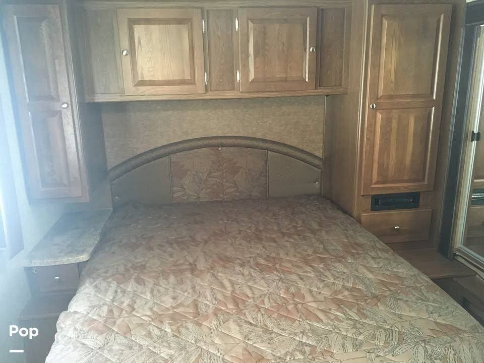 The rear bedroom hosts a comfortable queen bed with a wardrobe, and at the front of the coach, a cabover bunk for additional sleeping capacity.