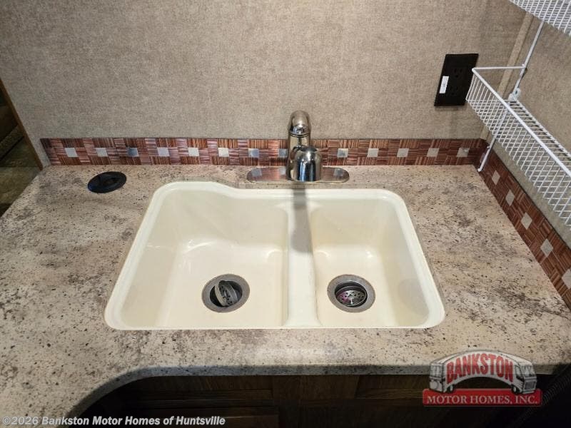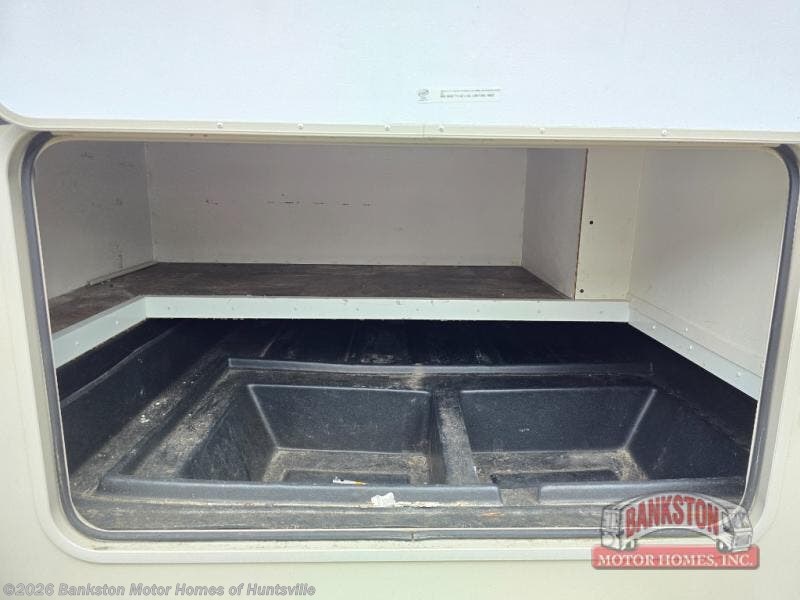 Model 320BH offers a combined kitchen and living space in front with a large slide out 75" sofa and three burner range with microwave oven above. There is a double kitchen sink with counter area, plus overhead cabinetry straight in from the door. A convenient pantry and refrigerator are found to the left of the entry, and a 42" x 71" booth dinette is found on the right side as you enter which also features overhead storage. There is a 57" x 95" bunk over the cab area for additional sleeping, or you can choose to have an optional entertainment center and storage instead if you do not need the extra sleeping space.