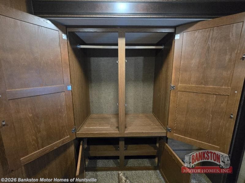 Heading toward the rear find a complete bath featuring a shower, toilet, sink, along with linen cabinet on the right side. Across the hall find a slide out set of bunk beds for the kids that is attached to the master bedroom wardrobe and dresser.