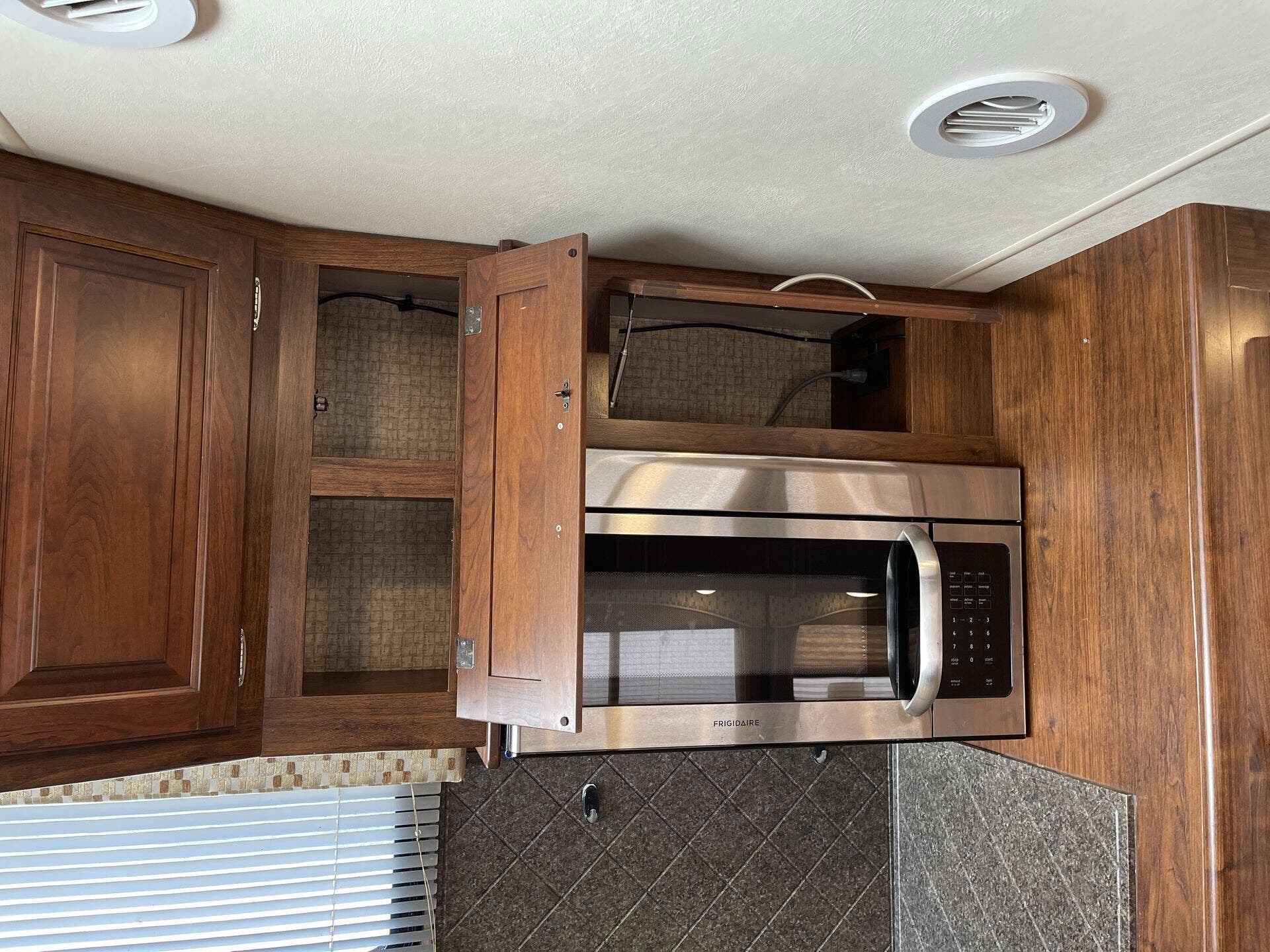 The Mirada boasts generous sleeping accommodations for up to 9 people, making it ideal for family vacations or group trips. Featuring a queen-sized bed, bunk beds, and cozy sleeping areas, everyone can enjoy restful nights. Inside, you'll find a well-designed living area with a U-shaped dinette for dining and relaxation. The modern interior is equipped with a comprehensive entertainment setup, including a TV, DVD player, CD player, and multiple roof vents for optimal airflow. Amenities like a microwave, oven, refrigerator with ample capacity, and a two-burner stove top make meal prep effortless, while the bathroom features a shower, toilet, and medicine cabinet for convenience.