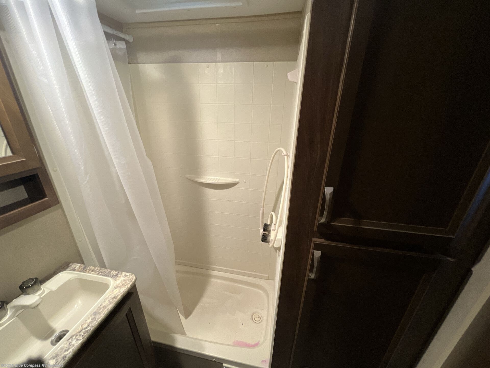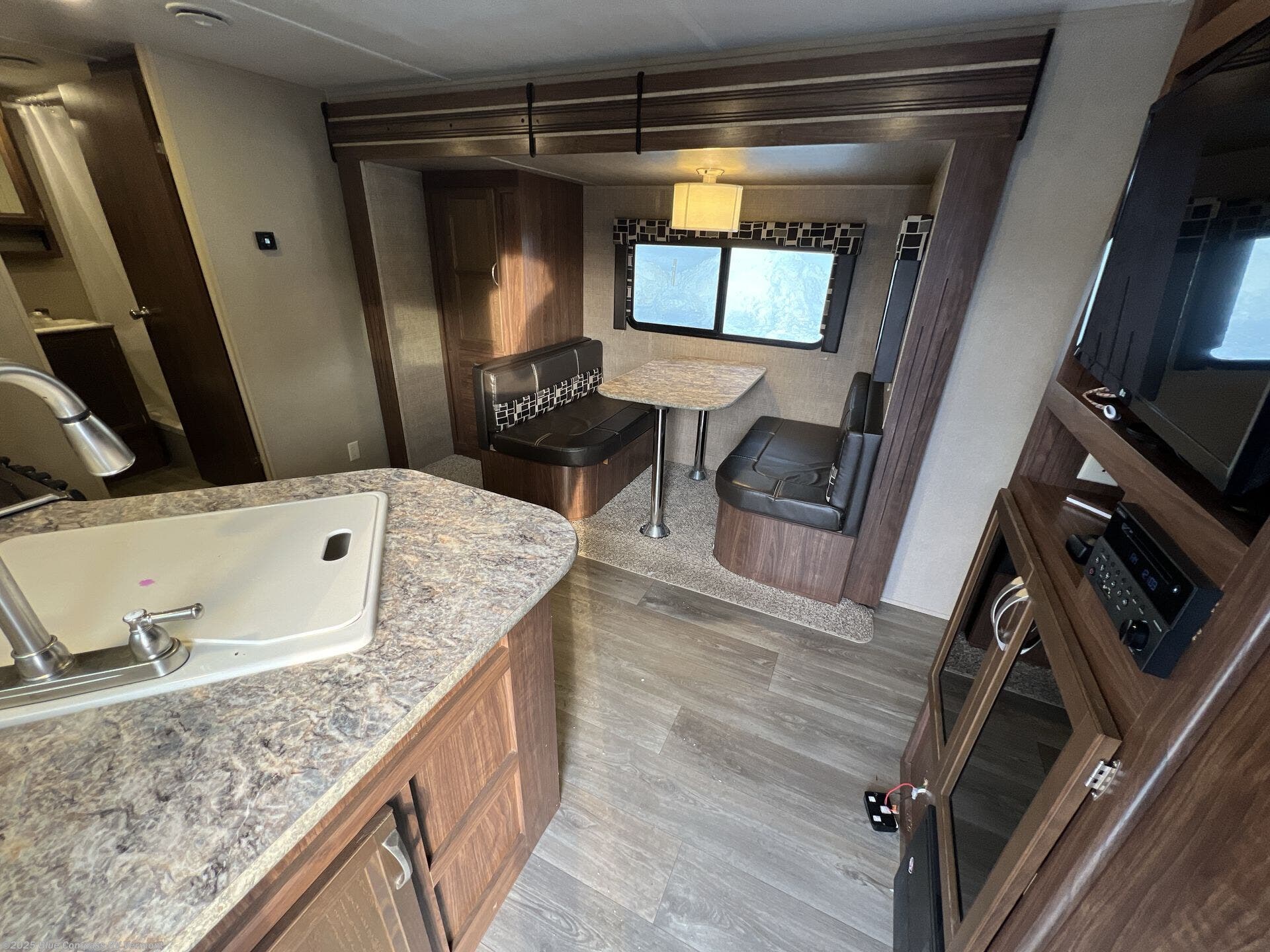 As you step inside to your left is a booth dinette with overhead cabinets, and a wardrobe. On the opposite side is a sofa on the interior wall facing the rear of the trailer. Along the road side wall, the kitchen includes a pantry, refrigerator, three burner range, microwave, double sink, and overhead cabinets for your dishes and things.