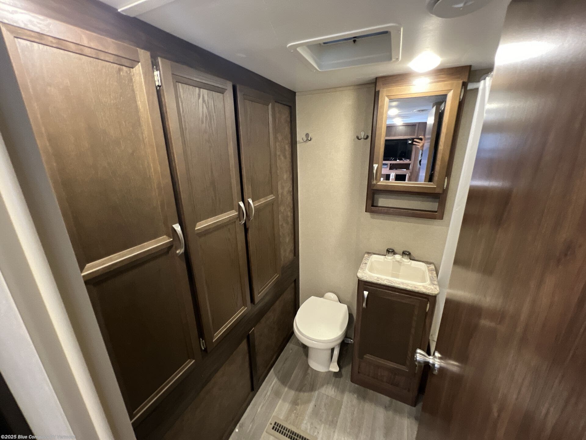 Heading towards the front, the bedroom includes a queen bed with an overhead shelf, and dual nightstands with shirt closets above.