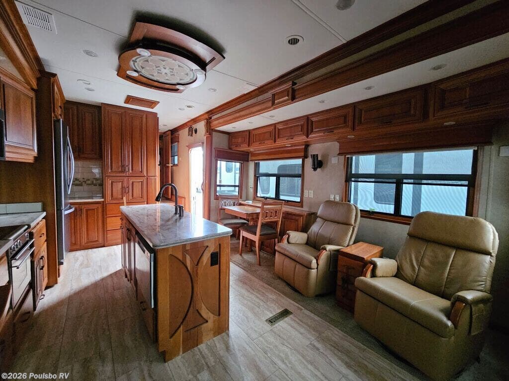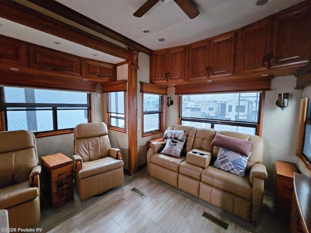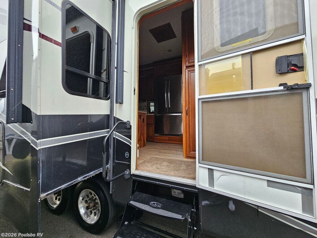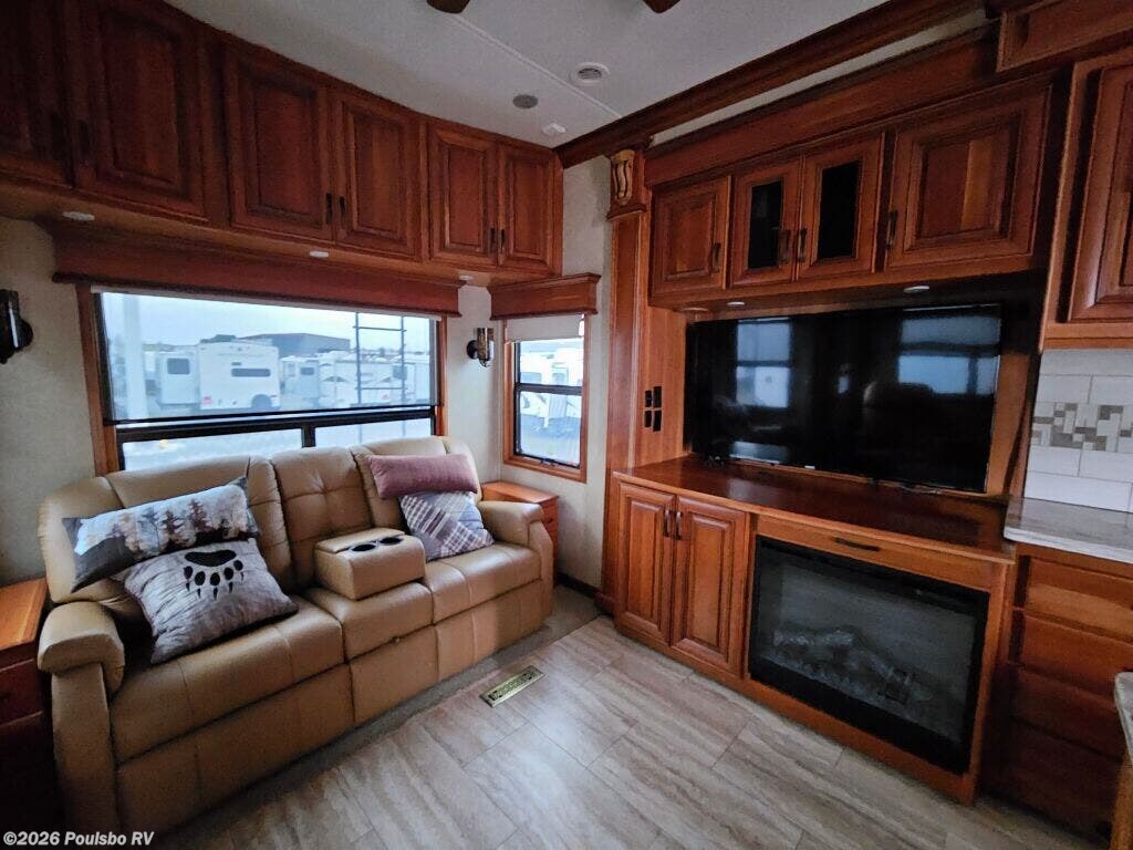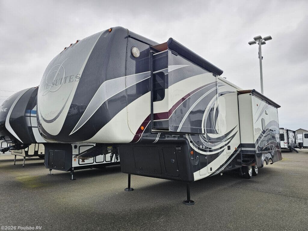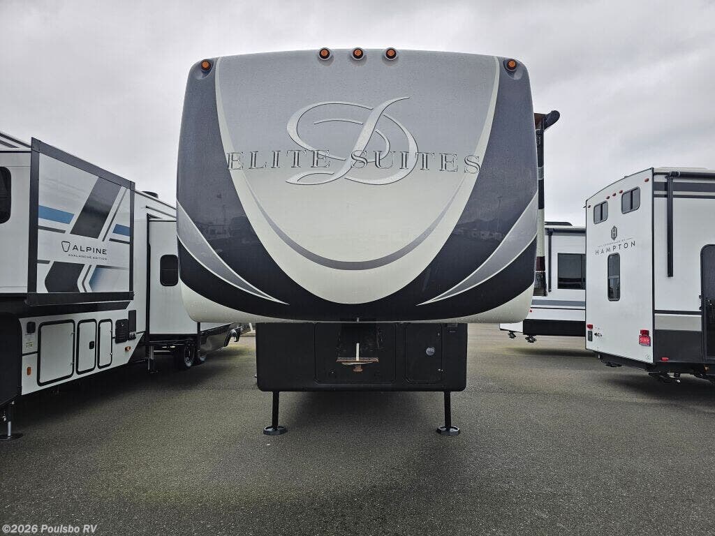 2016 DRV Elite Suites 38RSSA offers a spacious and luxurious living environment designed for travelers seeking comfort and style on the road. This used fifth wheel measures 39.1 feet in length and features three slide outs that expand the interior space, creating a welcoming atmosphere perfect for relaxation and entertainment. The interior layout provides ample living area with versatile sleeping accommodations, making it ideal for family or guests. Without a bunkhouse, the floor plan focuses on maximizing comfort through a combination of practical design and upscale finishes. This model includes convenient level jacks which provide stability during setup, ensuring a safe and steady experience at any campsite. The Elite Suites is equipped with an advanced audio system that enhances your leisure time by bringing high-quality sound to your favorite entertainment. Perfect for long stays or weekend escapes, this RV supports a lifestyle that blends the freedom of travel with the comforts of home. The dry weight of 16,300 pounds reflects the solid build and quality materials used throughout the unit. As a family-owned, award-winning local RV dealer with multiple locations in Sumner, Everett, Kent, and Mt. Vernon Washington, Poulsbo RV here to help you find the perfect RV. Stock#: CC5370, VIN: 5KEFA3827G1008035.