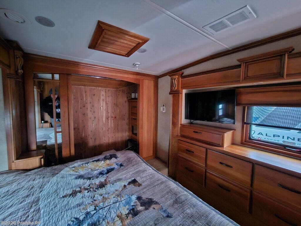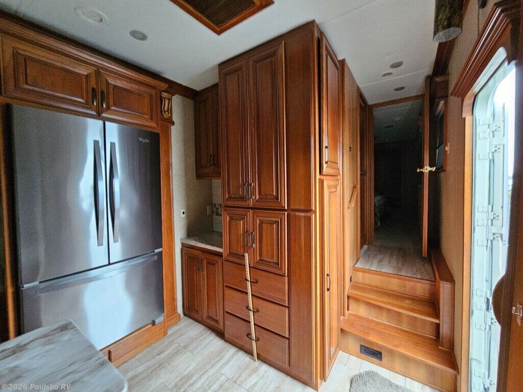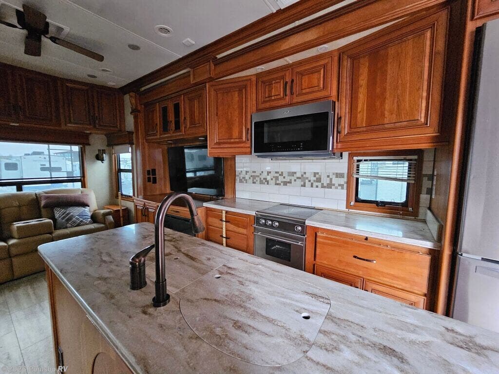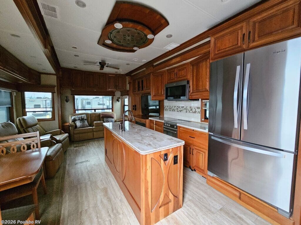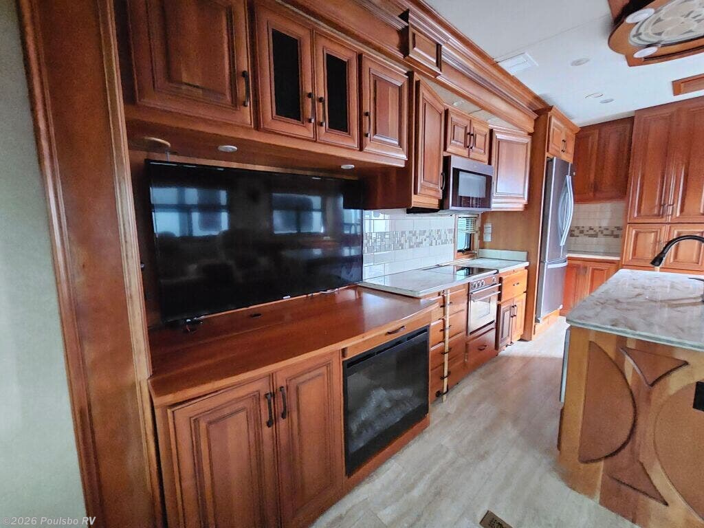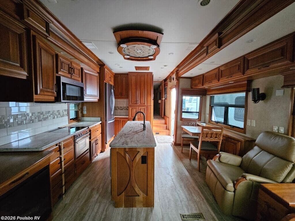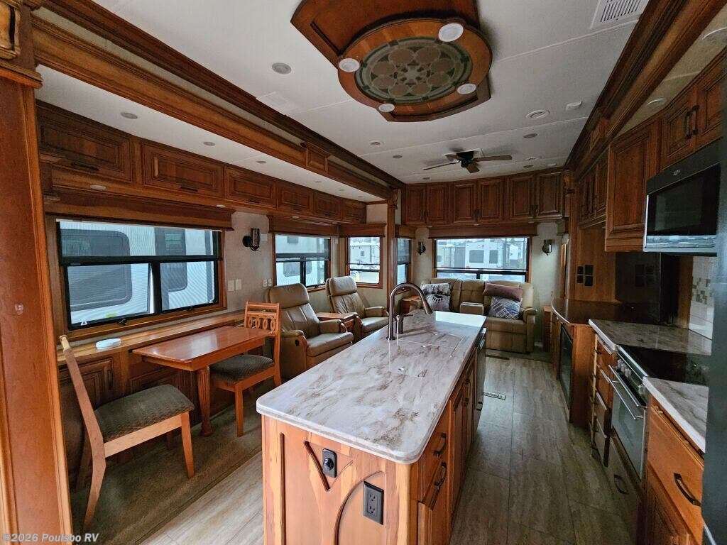 2016 DRV Elite Suites 38RSSA offers a spacious and luxurious living environment designed for travelers seeking comfort and style on the road. This used fifth wheel measures 39.1 feet in length and features three slide outs that expand the interior space, creating a welcoming atmosphere perfect for relaxation and entertainment. The interior layout provides ample living area with versatile sleeping accommodations, making it ideal for family or guests. Without a bunkhouse, the floor plan focuses on maximizing comfort through a combination of practical design and upscale finishes. This model includes convenient level jacks which provide stability during setup, ensuring a safe and steady experience at any campsite. The Elite Suites is equipped with an advanced audio system that enhances your leisure time by bringing high-quality sound to your favorite entertainment. Perfect for long stays or weekend escapes, this RV supports a lifestyle that blends the freedom of travel with the comforts of home. The dry weight of 16,300 pounds reflects the solid build and quality materials used throughout the unit. As a family-owned, award-winning local RV dealer with multiple locations in Sumner, Everett, Kent, and Mt. Vernon Washington, Poulsbo RV here to help you find the perfect RV. Stock#: CC5370, VIN: 5KEFA3827G1008035.