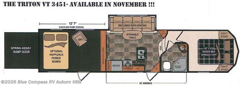 The fun doesn't stop when you decide to take a break in this new Triton fifth wheel toy hauler by Voltage. Model 3451 has plenty to get excited about on the inside!