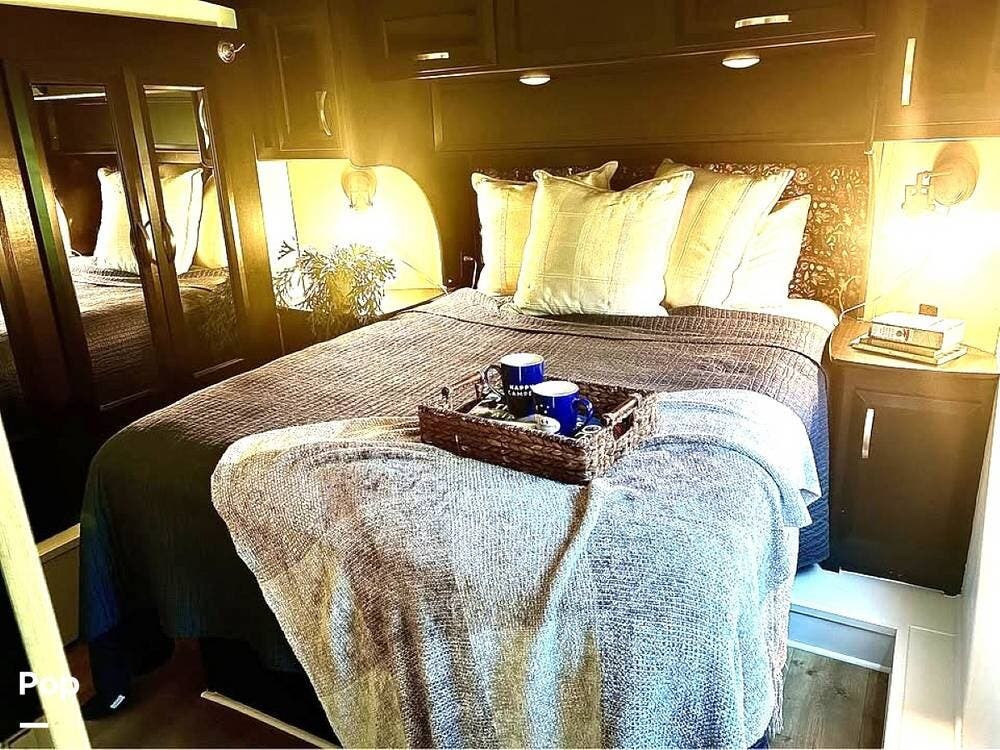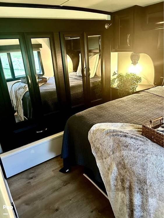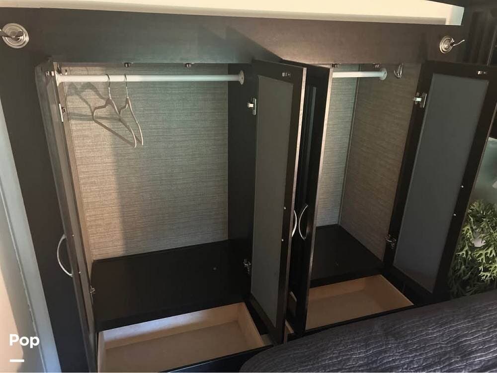 The master bedroom at the front of the RV features a walk-around queen bed with storage below and nightstands on each side. There is a large wardrobe closet on its own slide to maximize space in the bedroom. Relax and enjoy the flat screen TV.