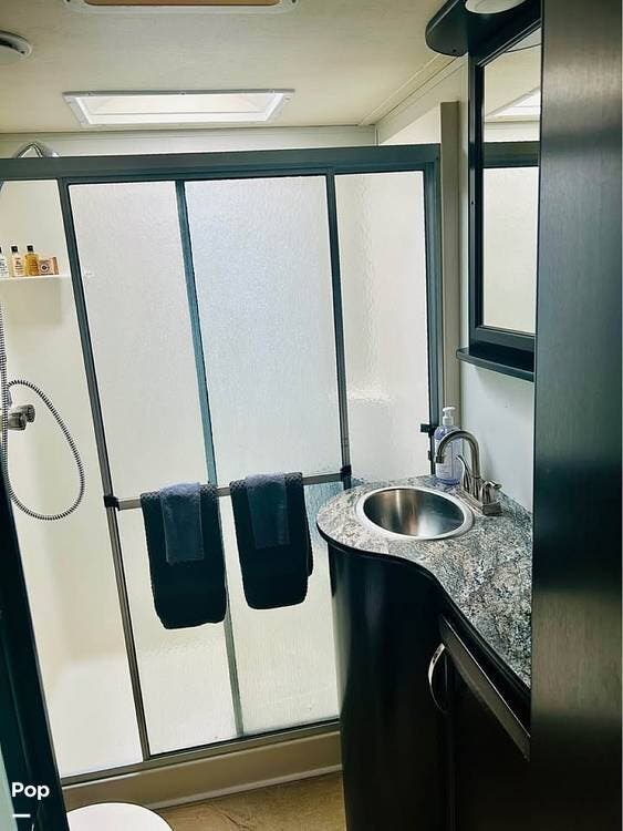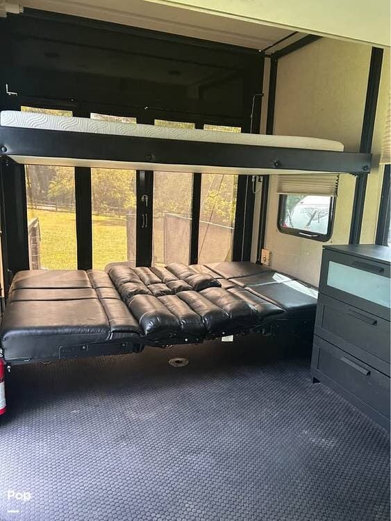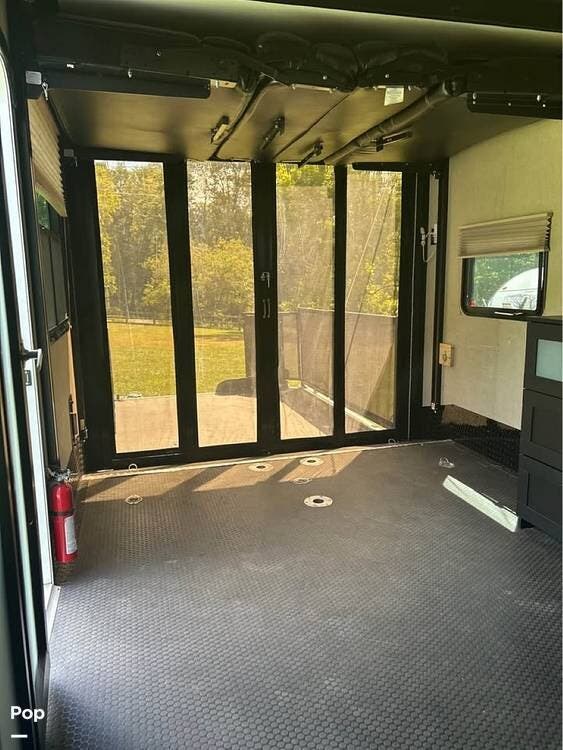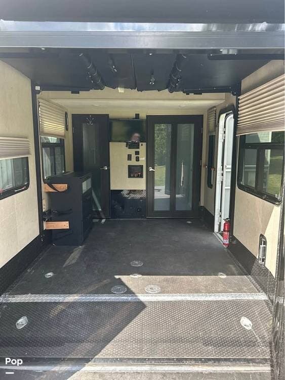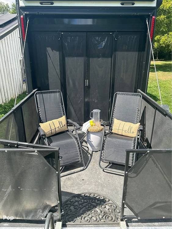 The 11' garage area is equipped with a 1/2 bath. There is a happyjack sofa/sleepers and a drop-down queen bed. The garage ramp door turns into an 8' party patio.
