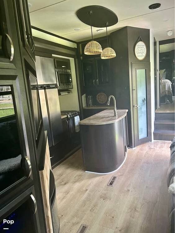 The main living area features a large kitchen with a peninsula island and a double-bowl sink. There is a refrigerator/freezer, stove, oven, and microwave.