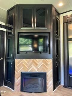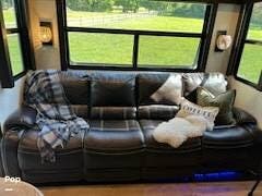 On the exterior, you can relax under the two power awnings for a total of 26' of shade and enjoy the outside entertainment center.