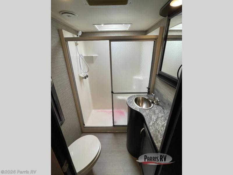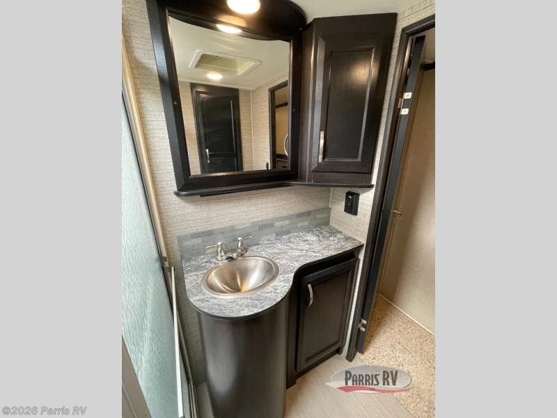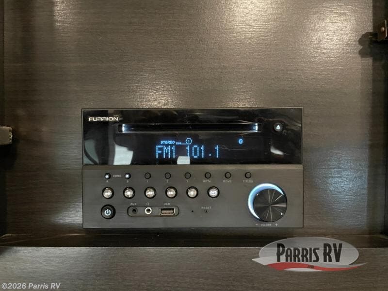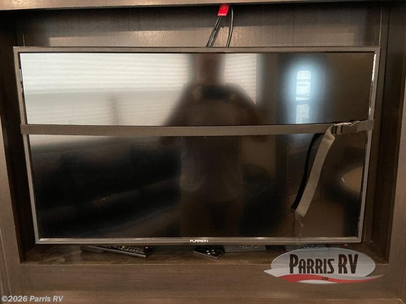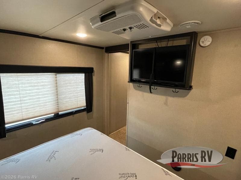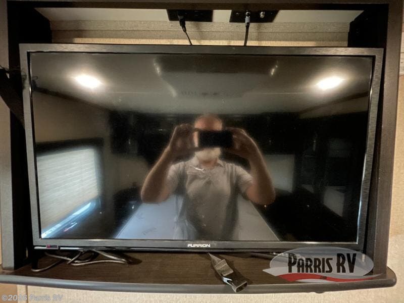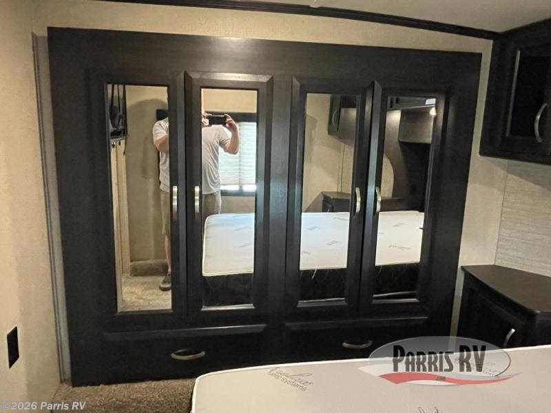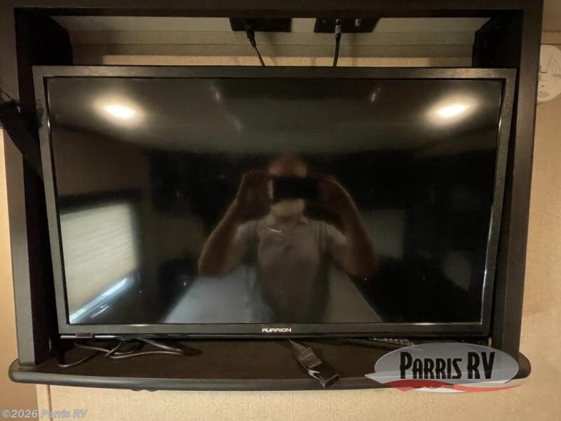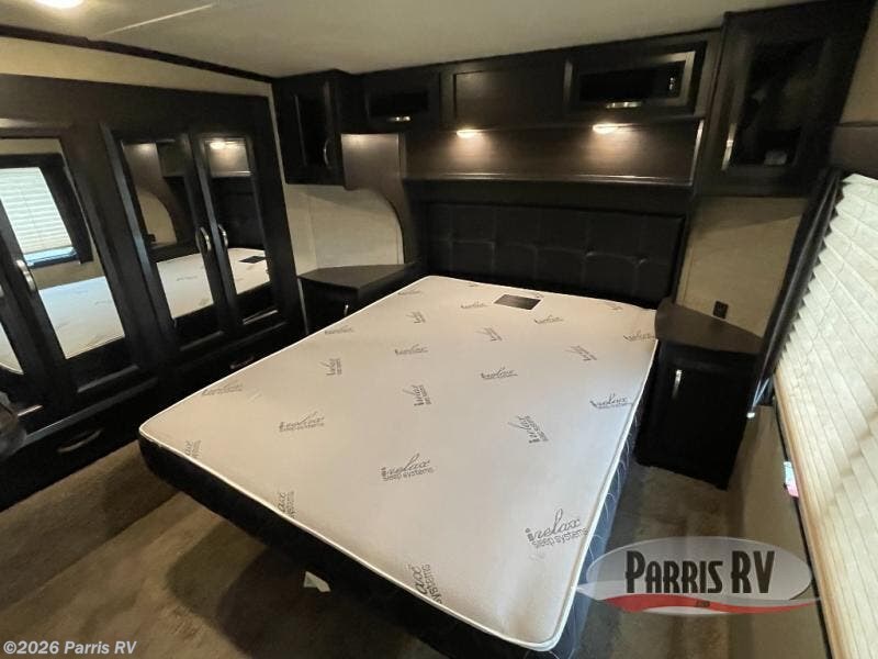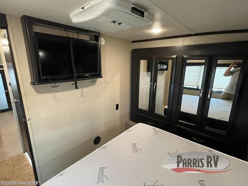 Continue down the hall to the sliding door that leads into the front bedroom featuring a queen bed with storage beneath. There are dual nightstands and dual wardrobe slide outs for added storage, plus a 32" TV and overhead cabinet too.