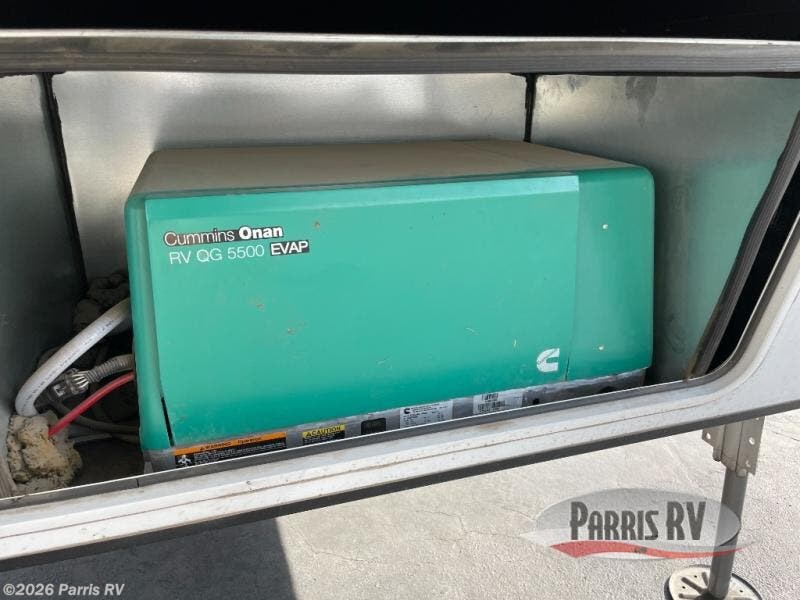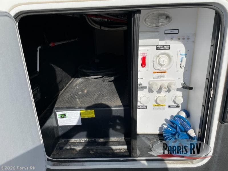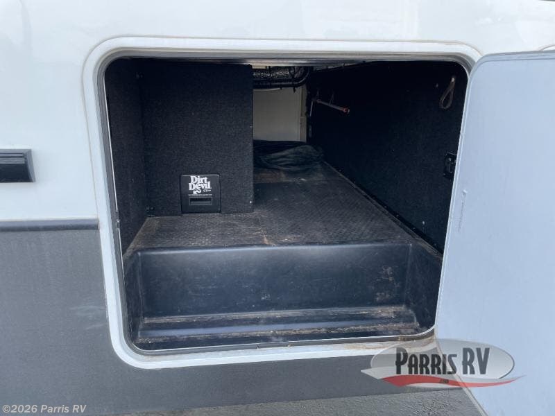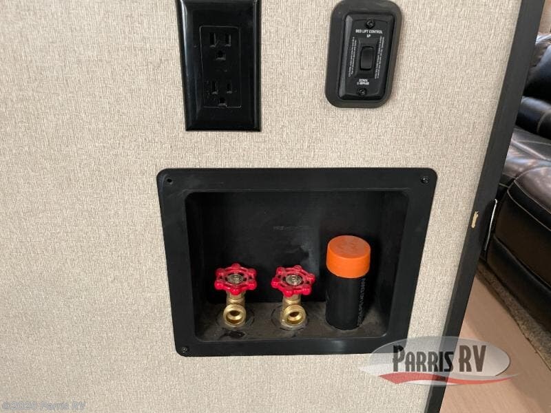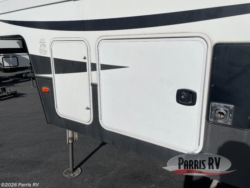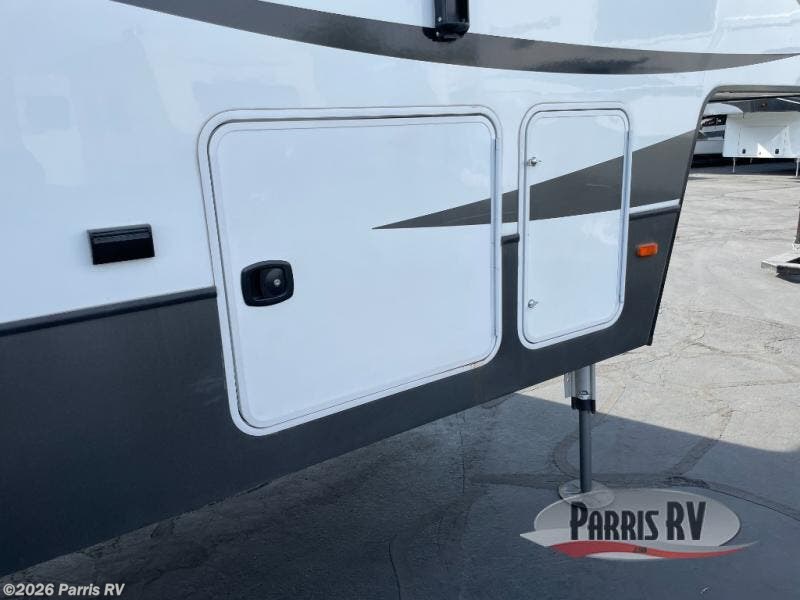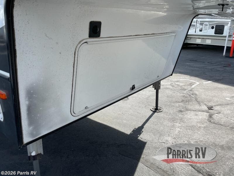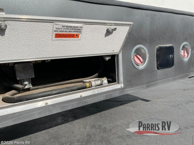 On the outside of this V-Series toy hauler enjoy a gasoline pump station, front pass-through storage, and an optional outside entertainment center located beneath the 18' awning area on the outside of the large sofa slide.