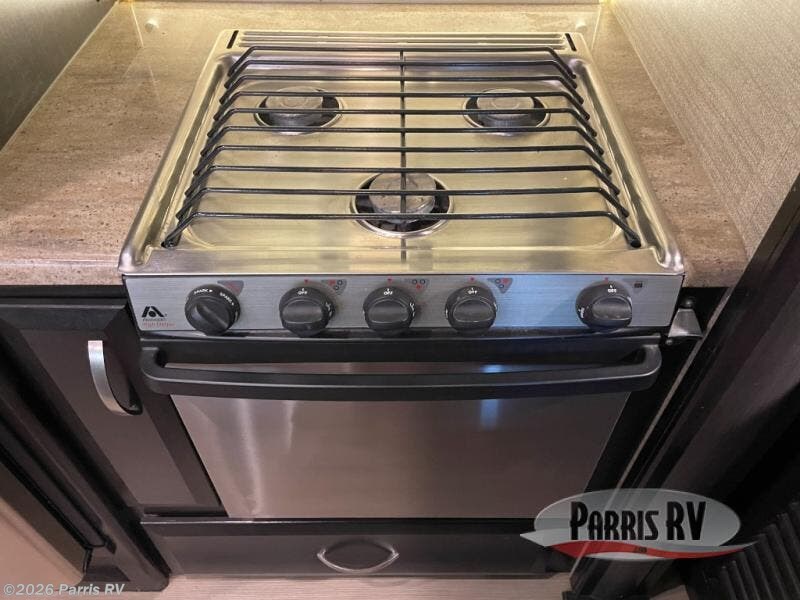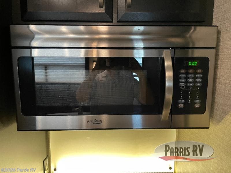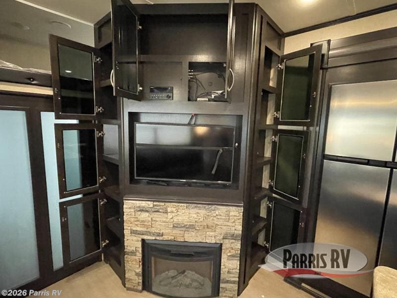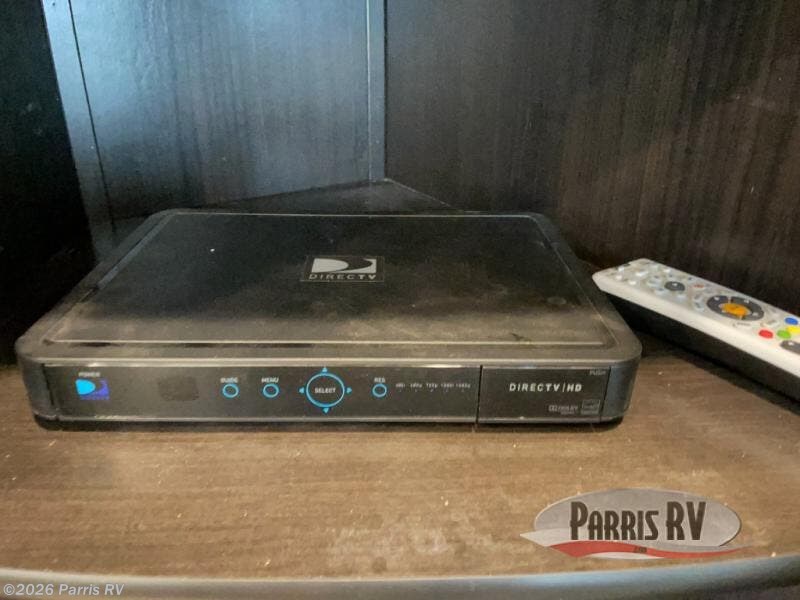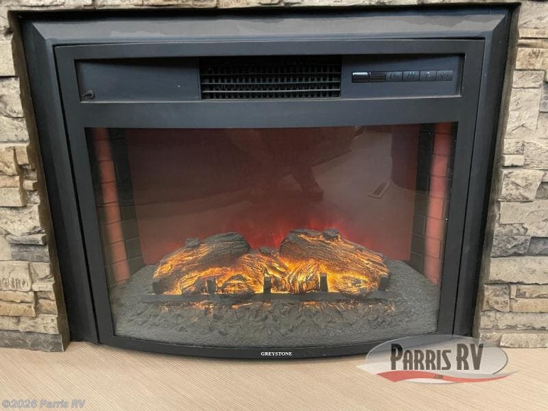 In the living area find a large slide out sofa seating area with stowable table which can easily view a 46" LED TV located across the room on the angled 1/2 bath wall. There is also a fireplace below that makes it feel a lot like home.