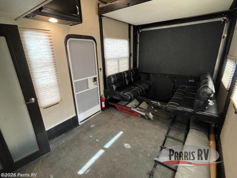 Enter this Dutchmen Voltage V-Series fifth wheel toy hauler and see that you can easily have fun inside, as well as outside with the toys you bring along. Model V3805 offers a 14' garage space, triple slides, and one and a half baths.