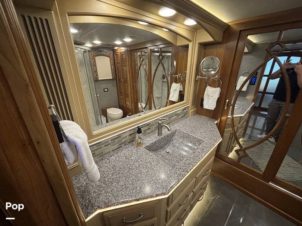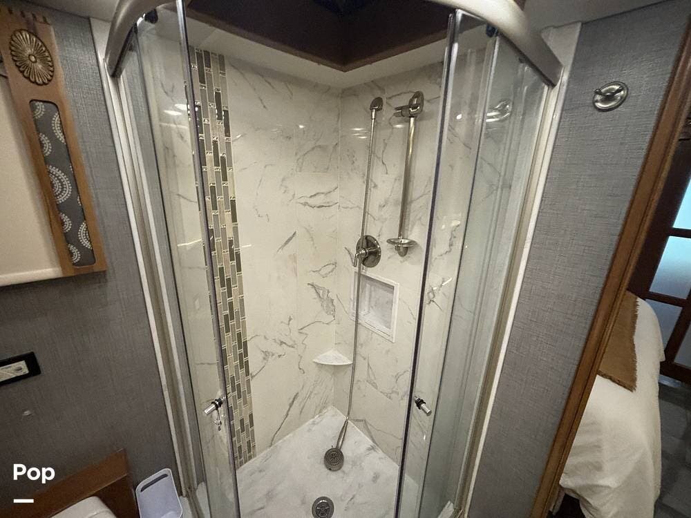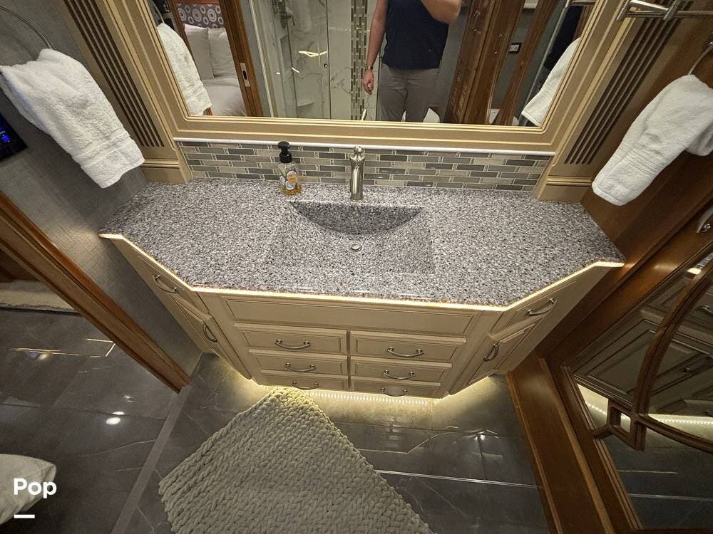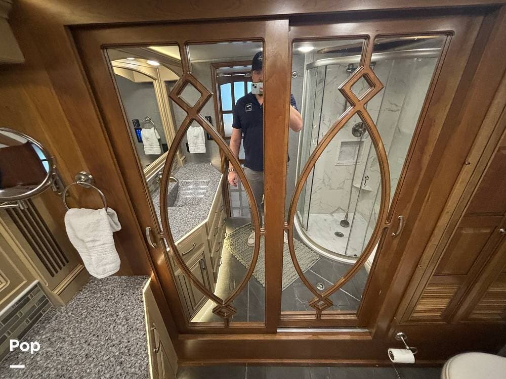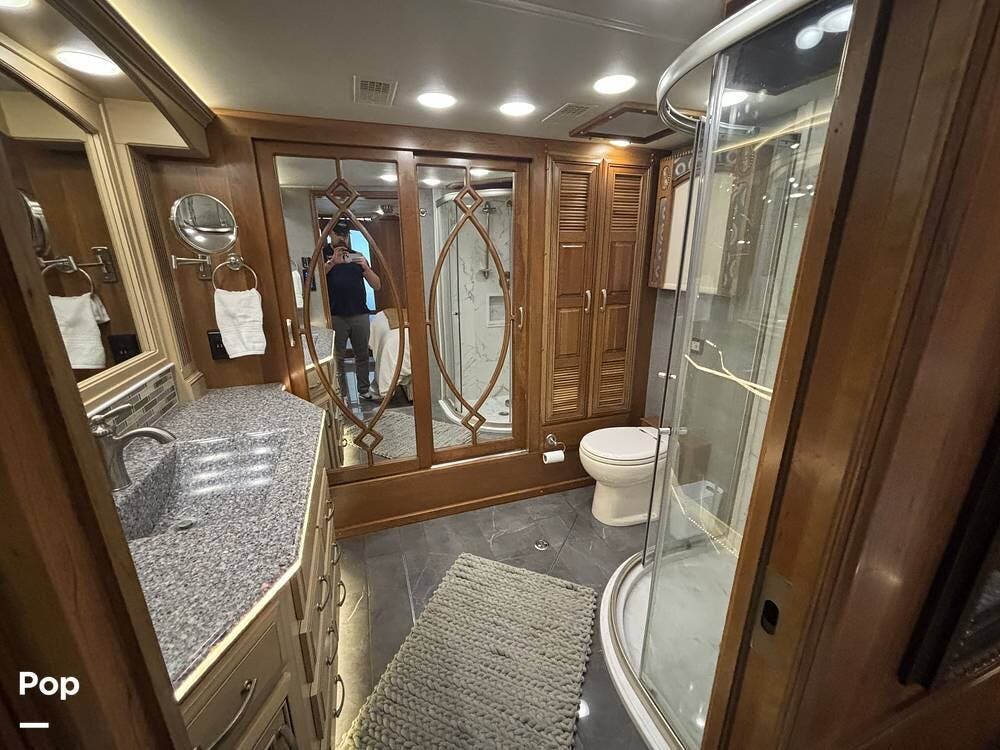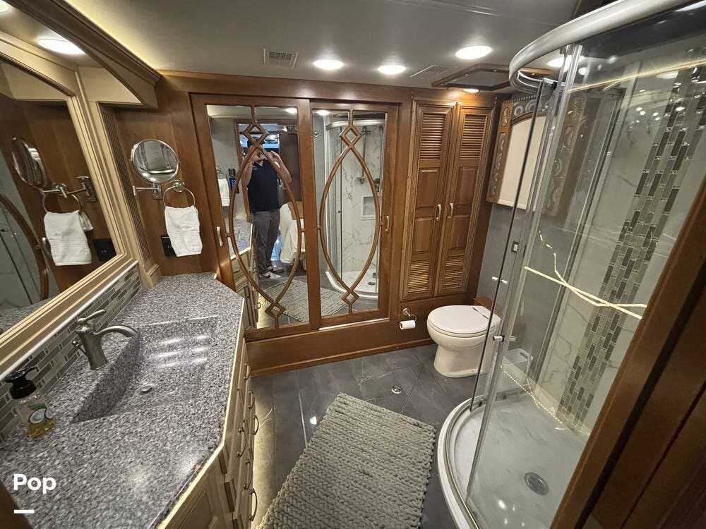 At the far end of the coach, the spacious rear bathroom features a large shower, a solid-surface vanity, and well-placed storage for toiletries and linens. The layout gives you plenty of room to move around, and the high-end finishes match the quality seen throughout the coach.