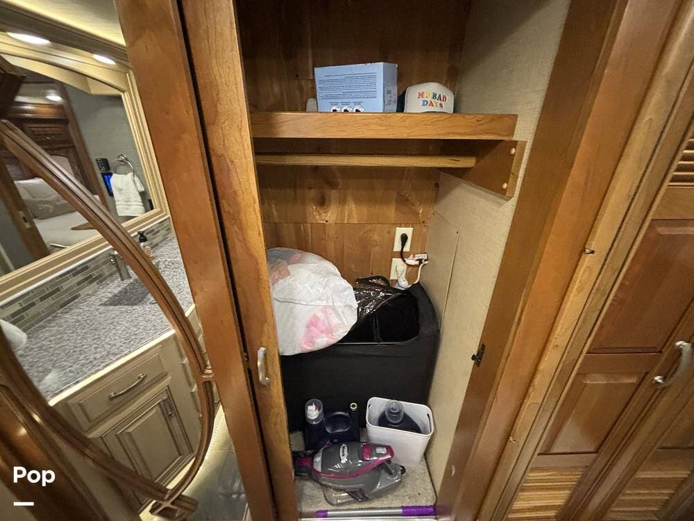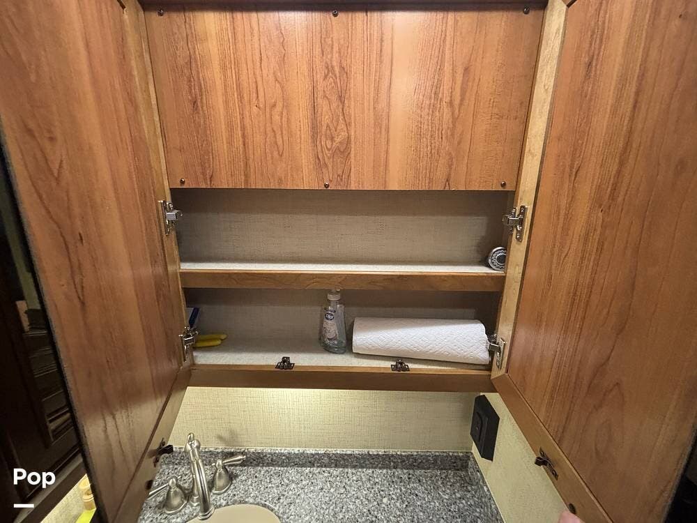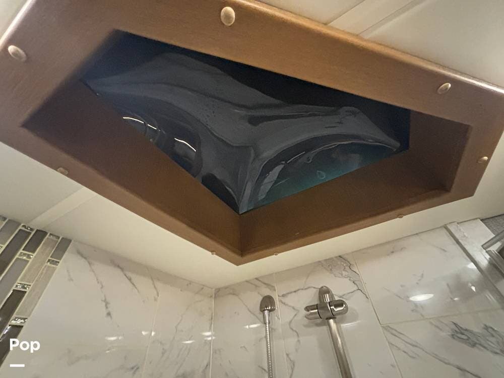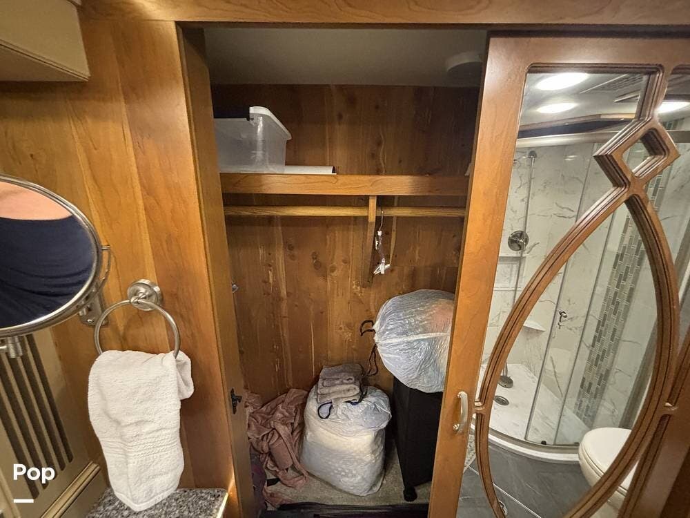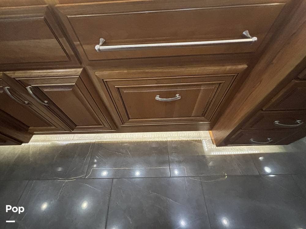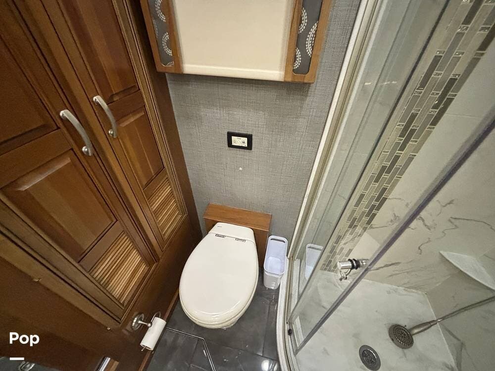 At the far end of the coach, the spacious rear bathroom features a large shower, a solid-surface vanity, and well-placed storage for toiletries and linens. The layout gives you plenty of room to move around, and the high-end finishes match the quality seen throughout the coach.