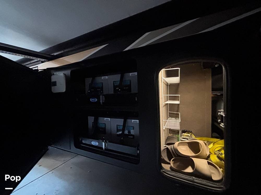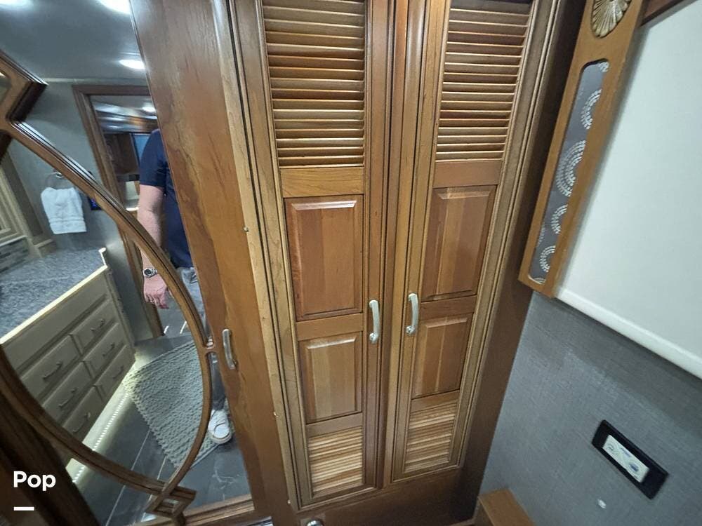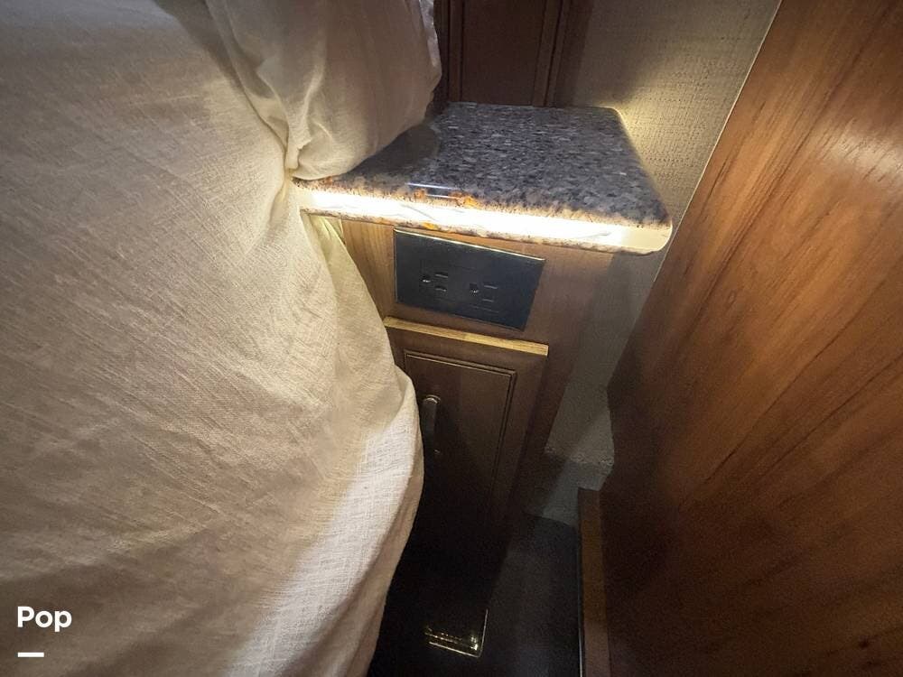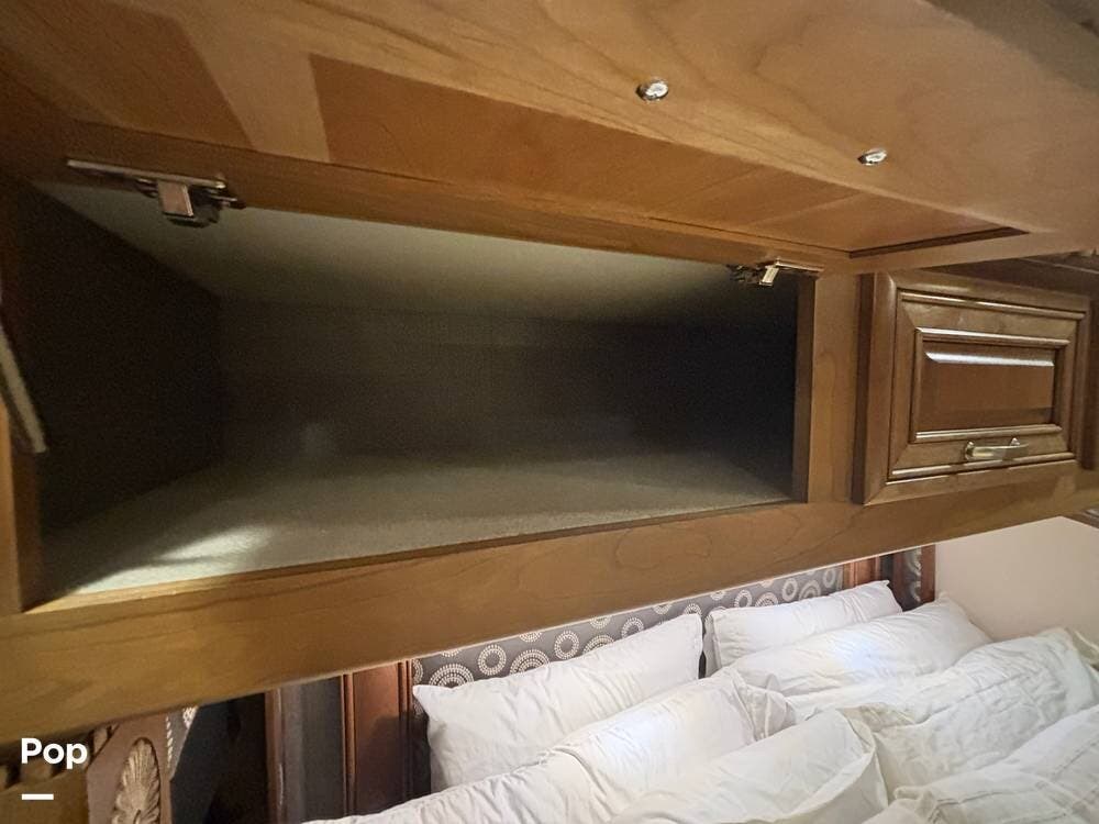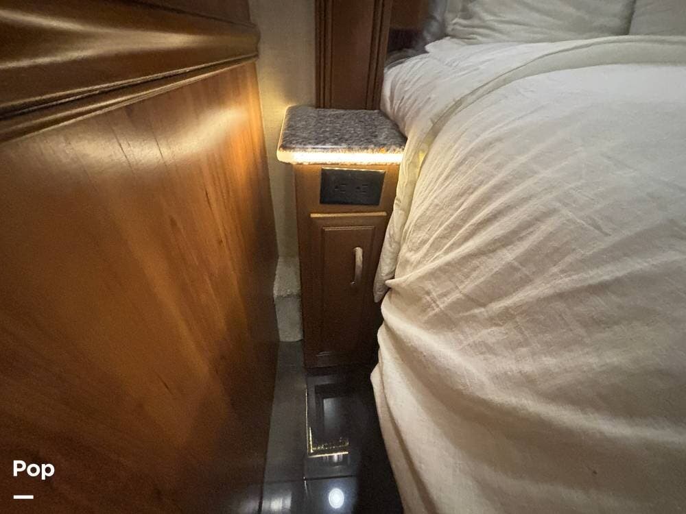 Moving toward the rear, the bedroom provides a private retreat with a king bed, overhead storage, and nightstands that allow for personal items and device charging. The wardrobe space is generous, with room for longer trips, and the sliding door offers privacy from the main living areas. The lighting and window treatments help create a quiet, restful environment, whether you're settling in for the night or relaxing during the day.