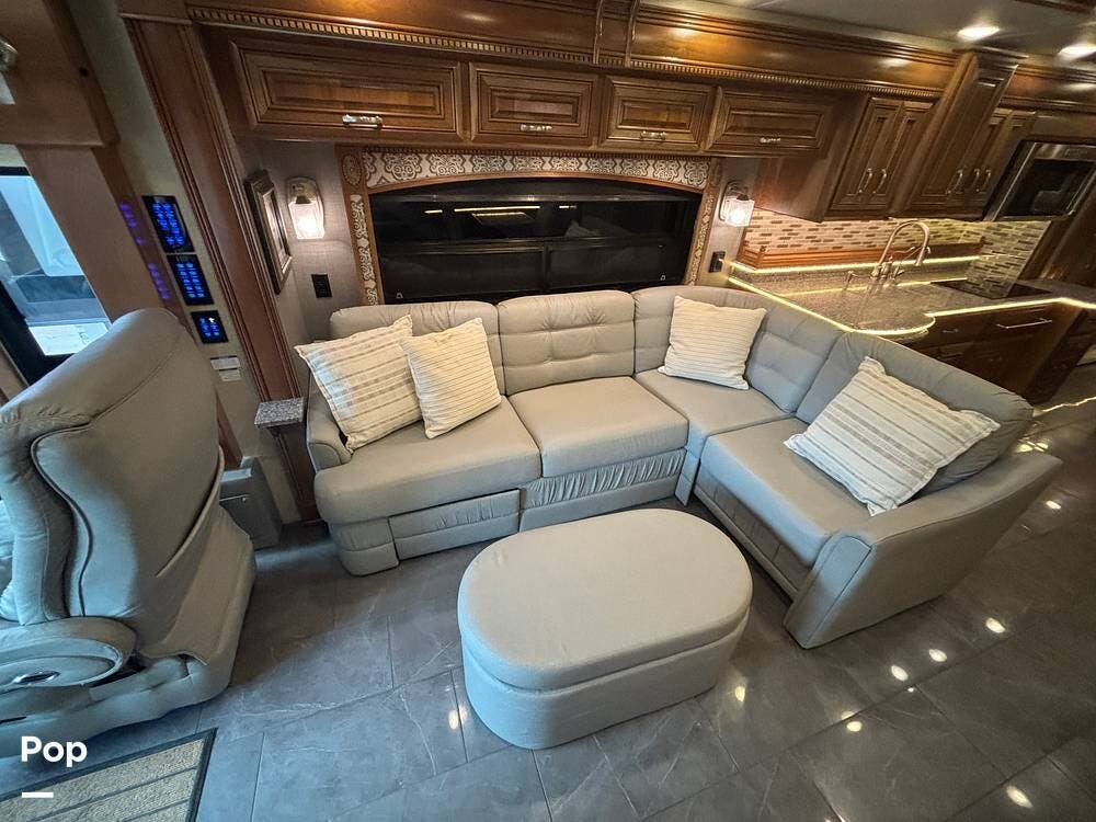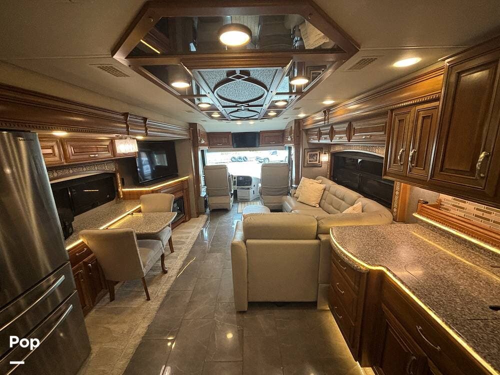 Stepping inside, the living area immediately feels open and inviting thanks to opposing slides and high-end residential finishes. The driver and passenger seats swivel to join the main seating area, creating a space that works both for relaxing on travel days and hosting guests when parked. The sofa sleeper sits opposite the large HDTV and fireplace, giving you a true residential lounge atmosphere. Soft-touch ceiling treatments, tile flooring, and integrated lighting help the entire space feel upscale and cohesive.