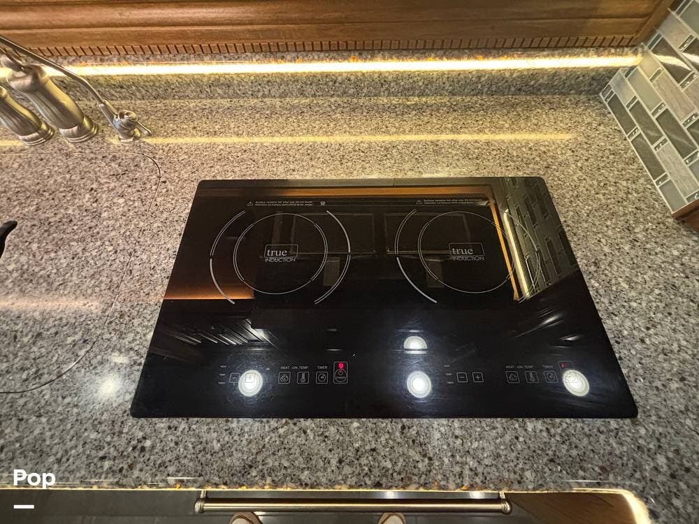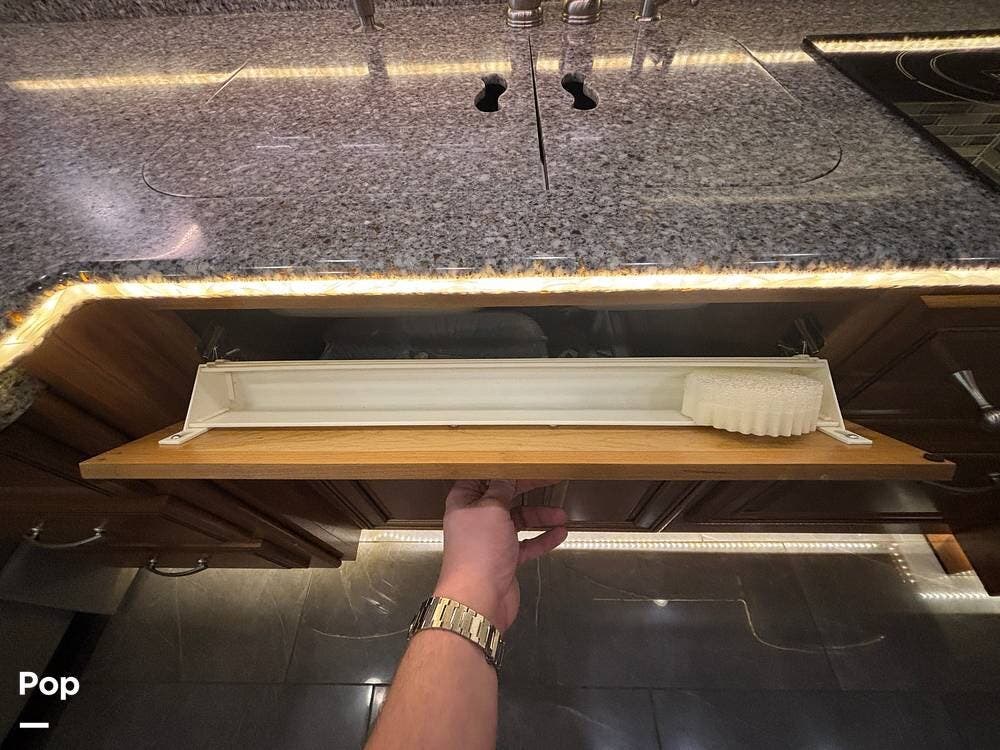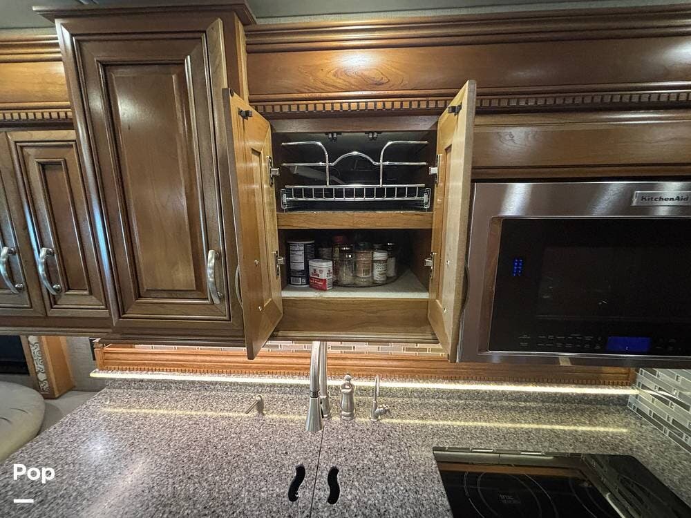 The kitchen is positioned mid-coach and is designed for extended stays or full-time use. Solid-surface countertops provide plenty of prep space, and the flush-mounted cooktop, convection microwave, and residential refrigerator make meal preparation feel familiar and efficient. You'll find thoughtful storage throughout the galley, including deep drawers, overhead cabinetry, and a pull-out pantry that helps keep dry goods organized. The kitchen flows naturally into the dining area, giving you a comfortable place to enjoy meals while still being part of the main living space.