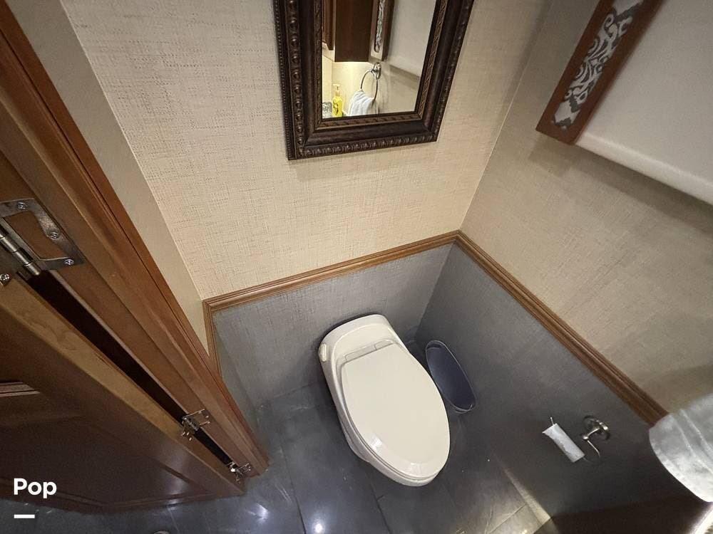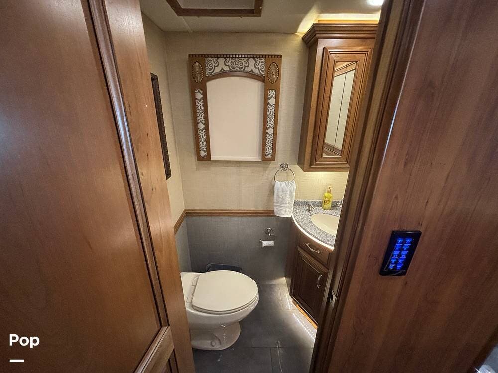 A convenient half bath is located mid-coach, making it easy for guests to use the facilities without entering the rear suite. Together, the two bathrooms enhance the functionality of the 44B floorplan and support comfortable travel for both owners and visitors.