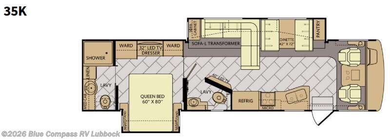 There is plenty of storage with all of the overhead cabinets in this motor home. You also have many options available to you such as, a front 32" LED TV, exterior entertainment center, three burner range with oven, washer and dryer, electric fireplace, residential refrigerator, hide-a-loft drop down queen bed, facing dinette, and a free-standing dinette with credenza.
