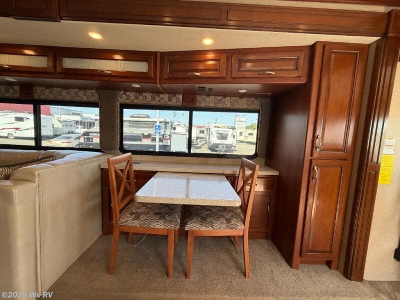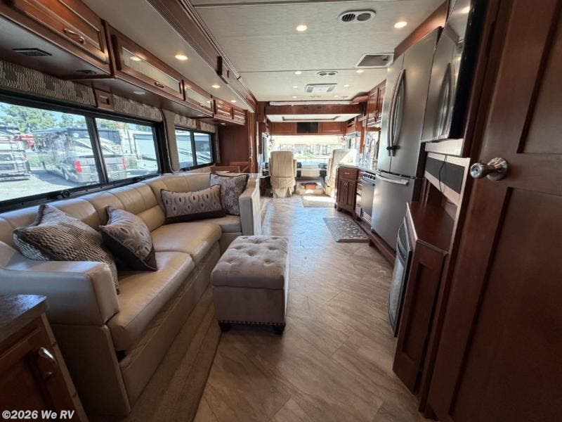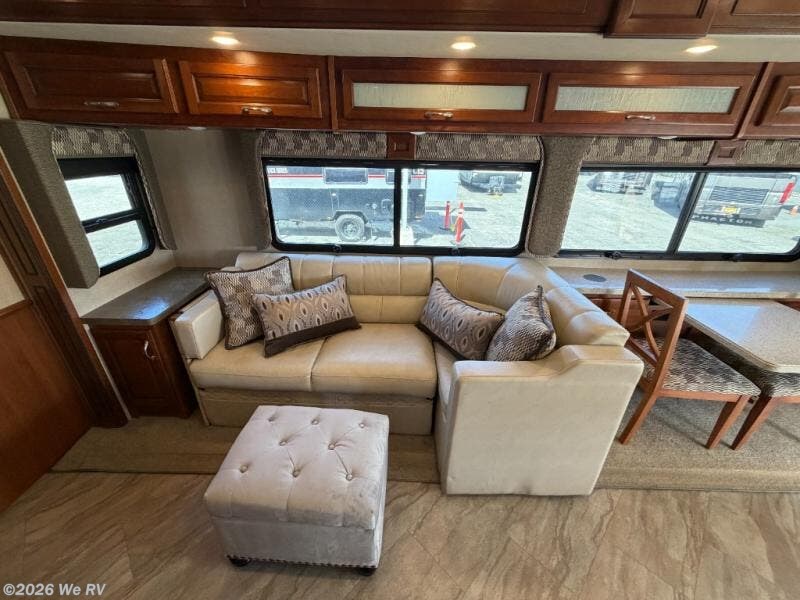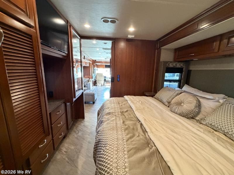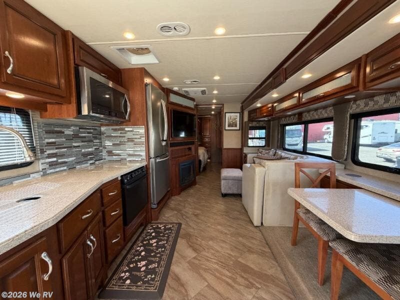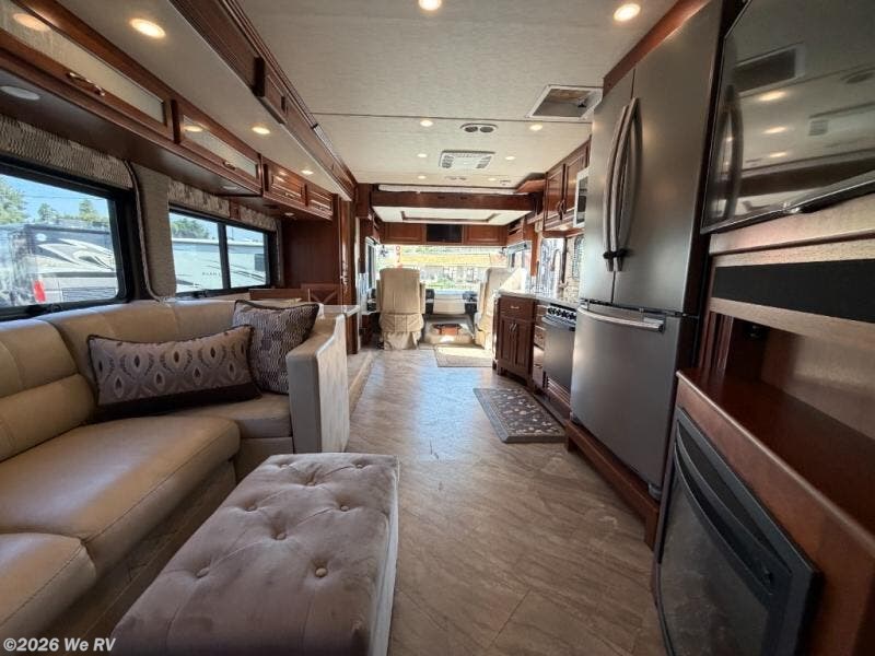 There is plenty of storage with all of the overhead cabinets in this motor home. You also have many options available to you such as, a front 32" LED TV, exterior entertainment center, three burner range with oven, washer and dryer, electric fireplace, residential refrigerator, hide-a-loft drop down queen bed, facing dinette, and a free-standing dinette with credenza.