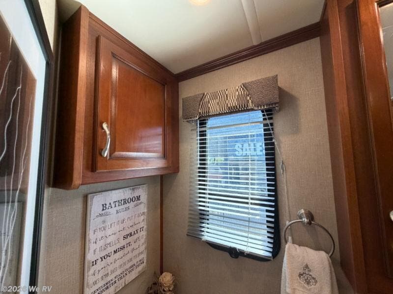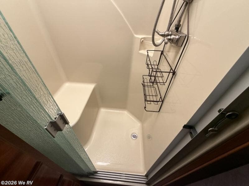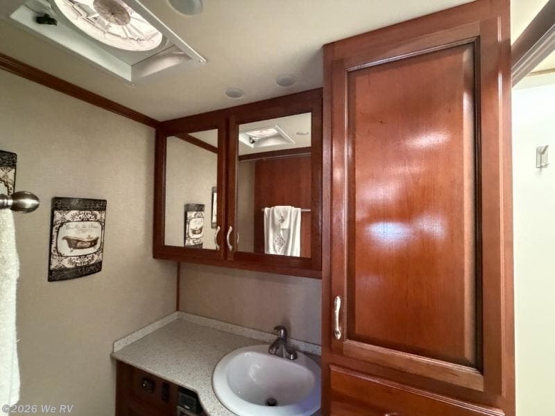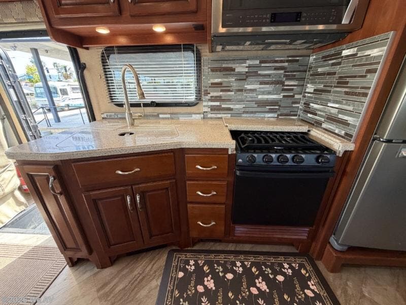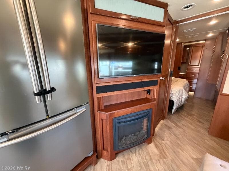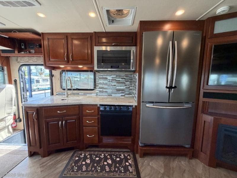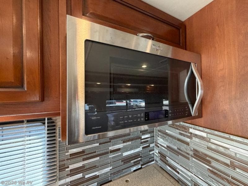 There is plenty of storage with all of the overhead cabinets in this motor home. You also have many options available to you such as, a front 32" LED TV, exterior entertainment center, three burner range with oven, washer and dryer, electric fireplace, residential refrigerator, hide-a-loft drop down queen bed, facing dinette, and a free-standing dinette with credenza.