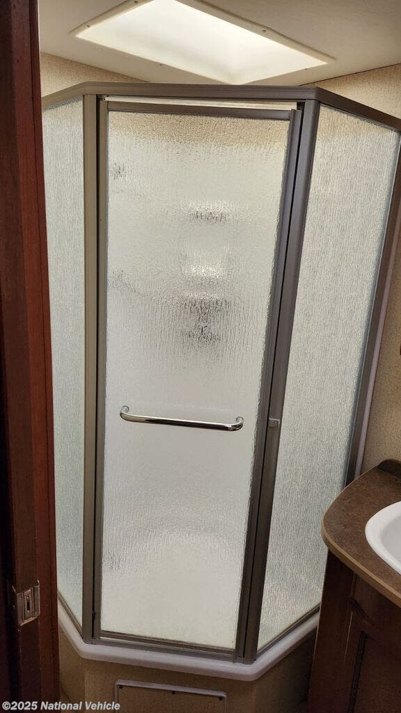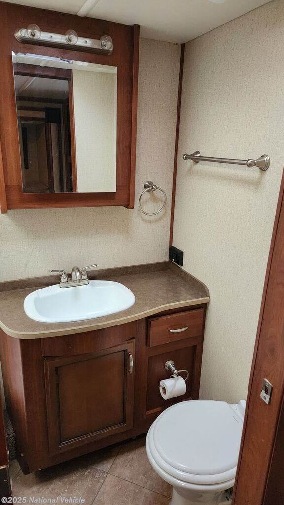 This coach features a bathroom complete with shower, toilet, and a sink with medicine cabinet above for your convenience.