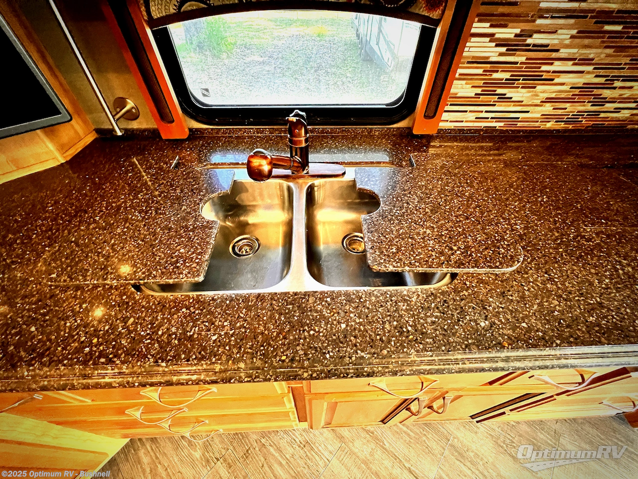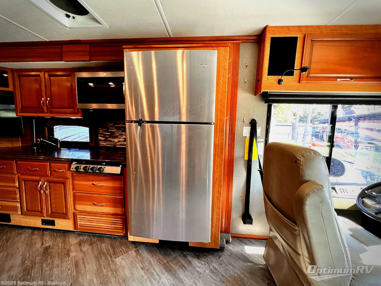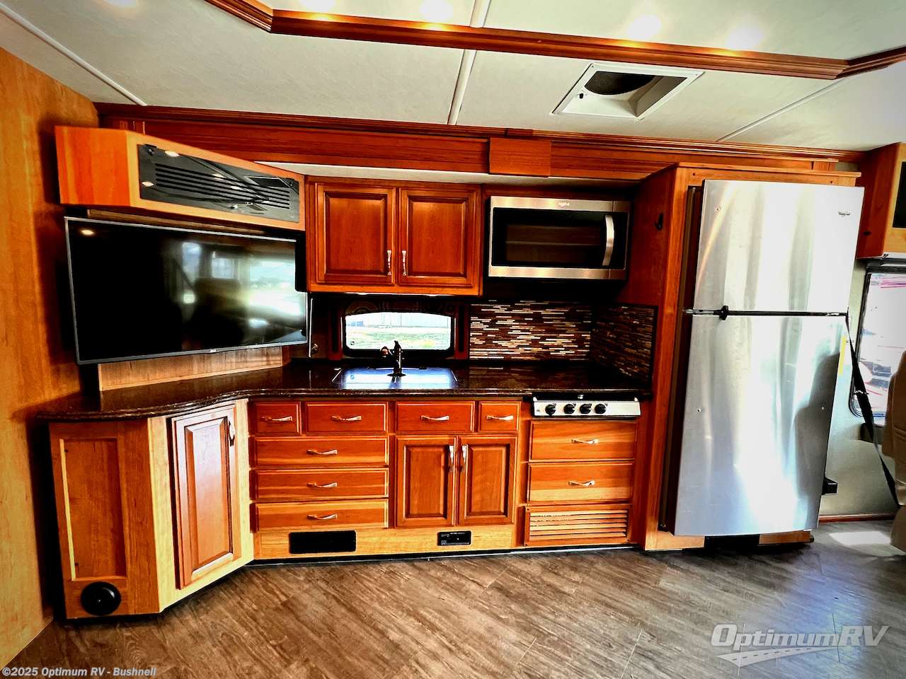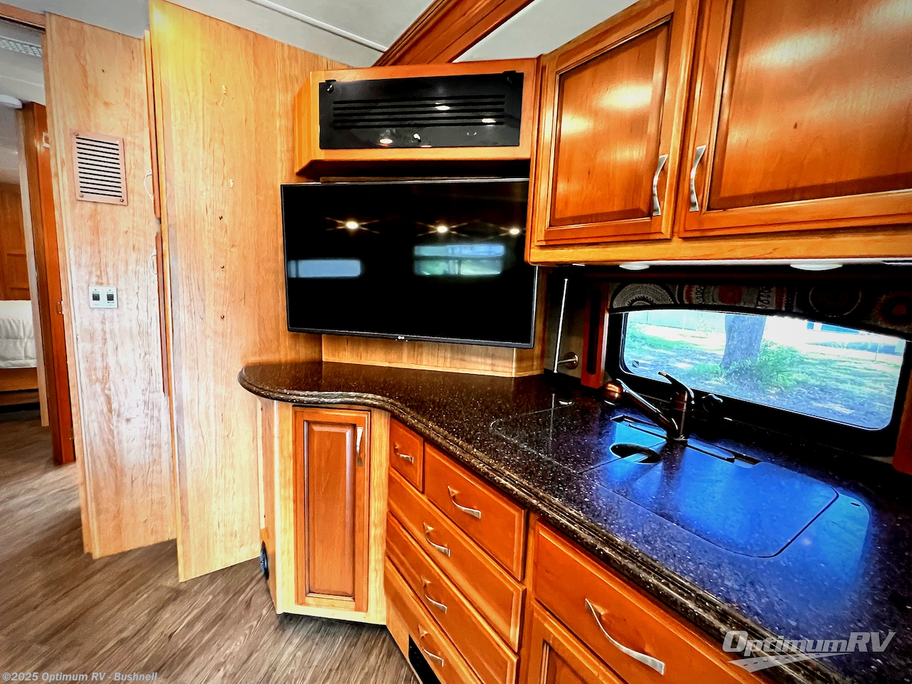 The opposite kitchen slide features a residential refrigerator, a three burner cook-top and generous kitchen sink. There are also several cabinets for storage both above and below the counter for dishes and pots and pans. A corner 42" LED TV is on the inside end of the kitchen slide and can easily be viewed by any seating in the space.