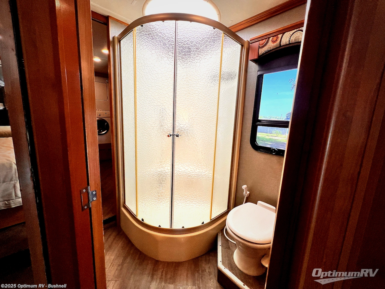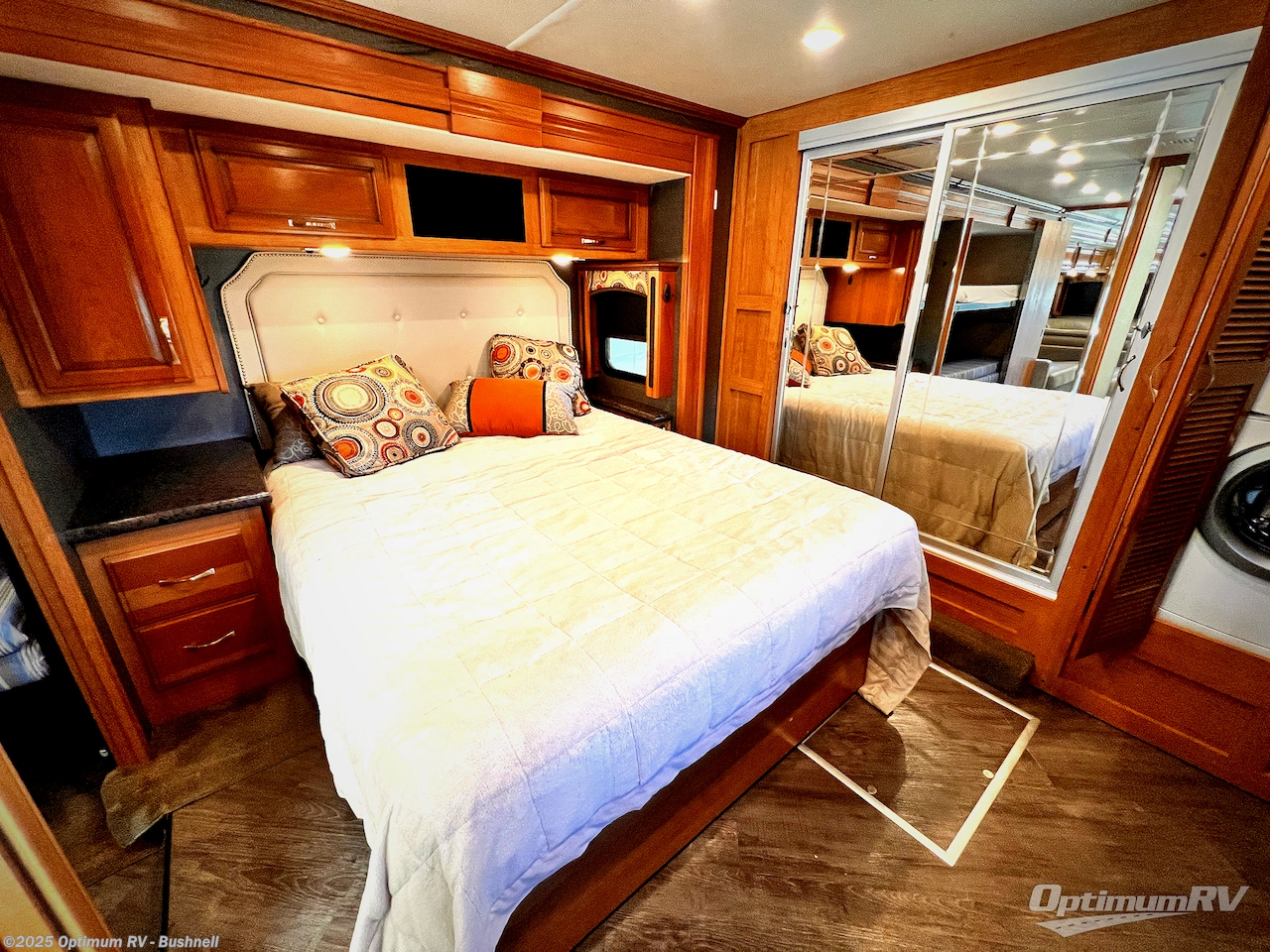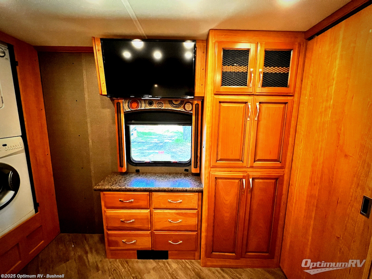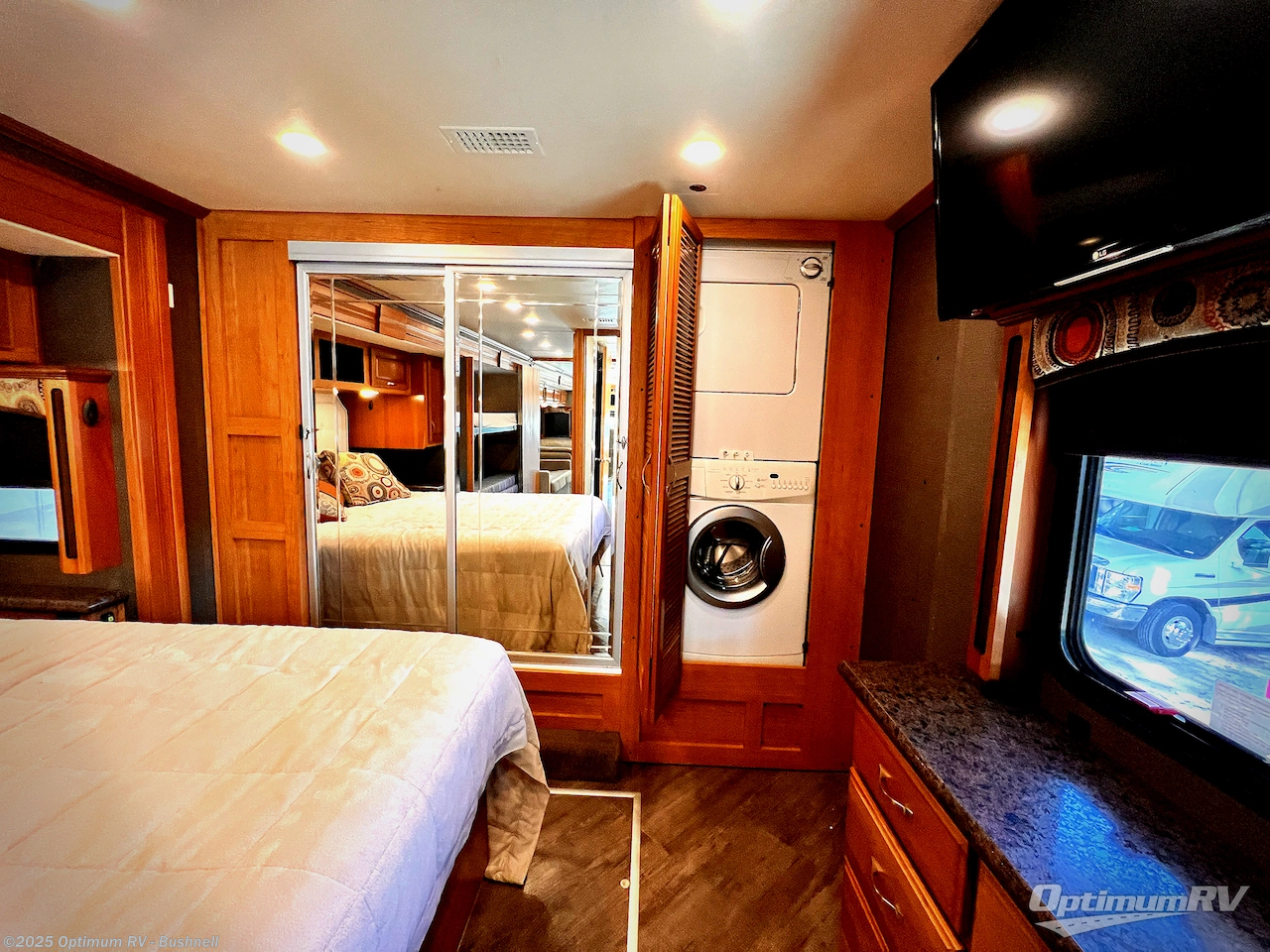 The very rear of this Pace Arrow model 38B offers a master bedroom with ample room thanks to the queen bed and nightstands being in the tail end of the full wall slide out. Along the rear wall there is a wardrobe, and second wardrobe space with shelves. Here you can choose to add the optional stackable washer and dryer if you like so you don't have to stop to take care of laundry and delay having more fun. Opposite the bed find a 32" LED TV, plus more storage.