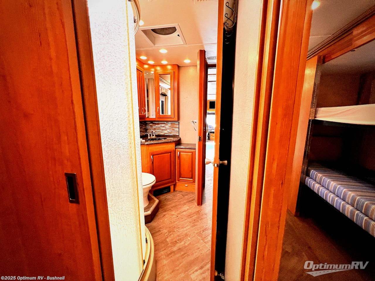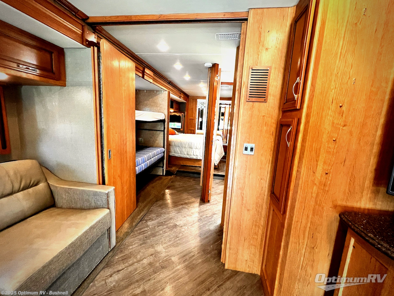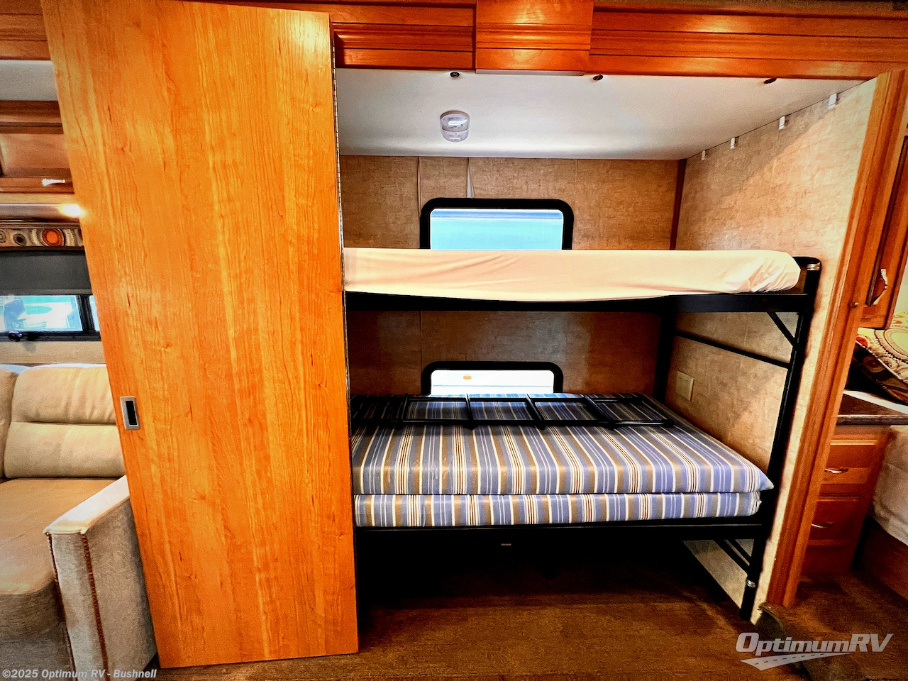 Opposite the bath in the full wall slide find a set of bunk beds that are 28" x 73". Draw closed the sliding doors for more privacy when sleeping at night.