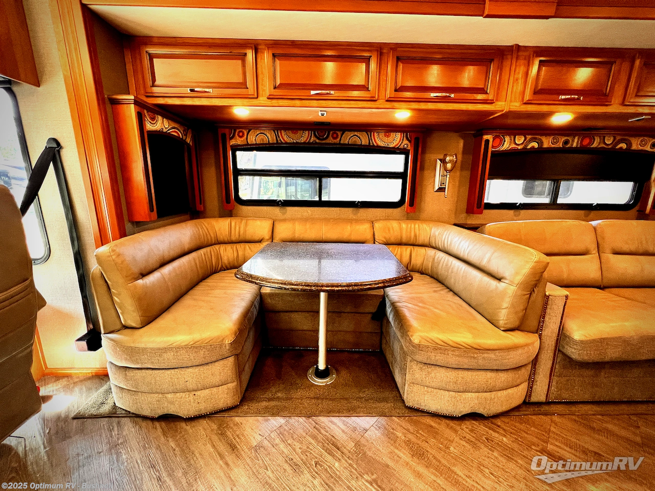 Step inside in front of the passenger seat. Looking back on your left you will see lots of seating with the start of the full wall slide. There is an 81" x 44" u-shaped dinette and 70" sofa with air mattress. They both provide seat belts, so your rear travelers will be safe when moving down the road. There is also an overhead shelf above the sofa.