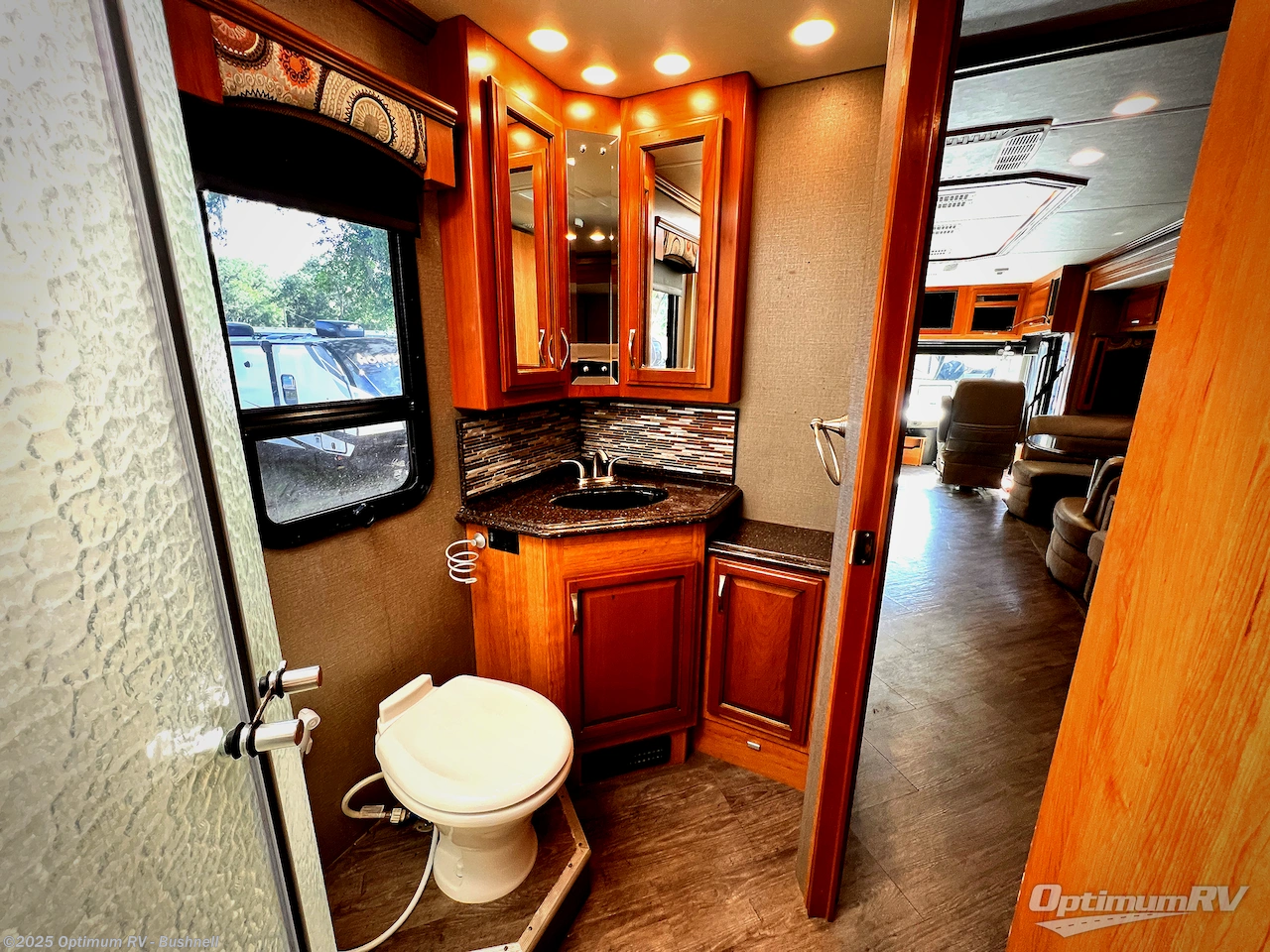 Heading toward the rear of the unit you will find a side aisle bath on your right. Inside the bath enjoy a corner shower, toilet, and vanity with sink. There is also a storage cabinet for linens and things.