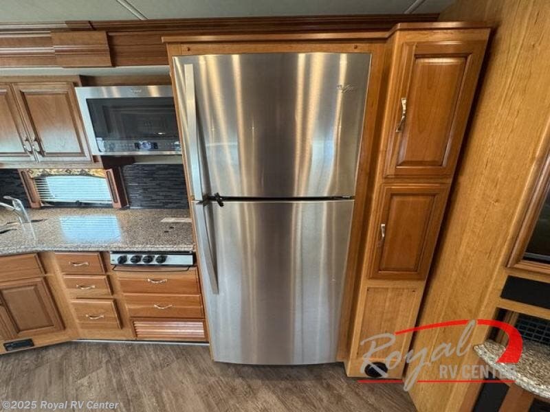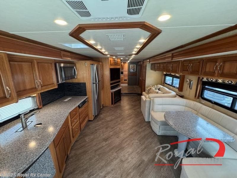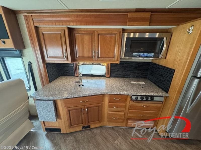 Step inside in front of the passenger side seat. The kitchen is directly behind and features a spacious kitchen sink with counter-top extension, a three burner range, overhead microwave oven, residential size refrigerator, and storage pantry for your dry and canned goods.