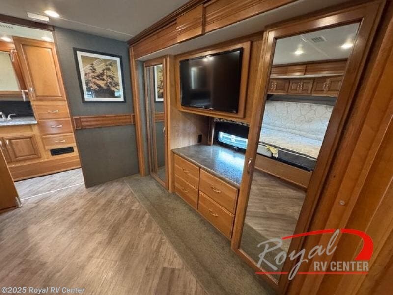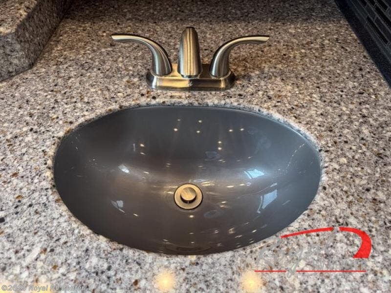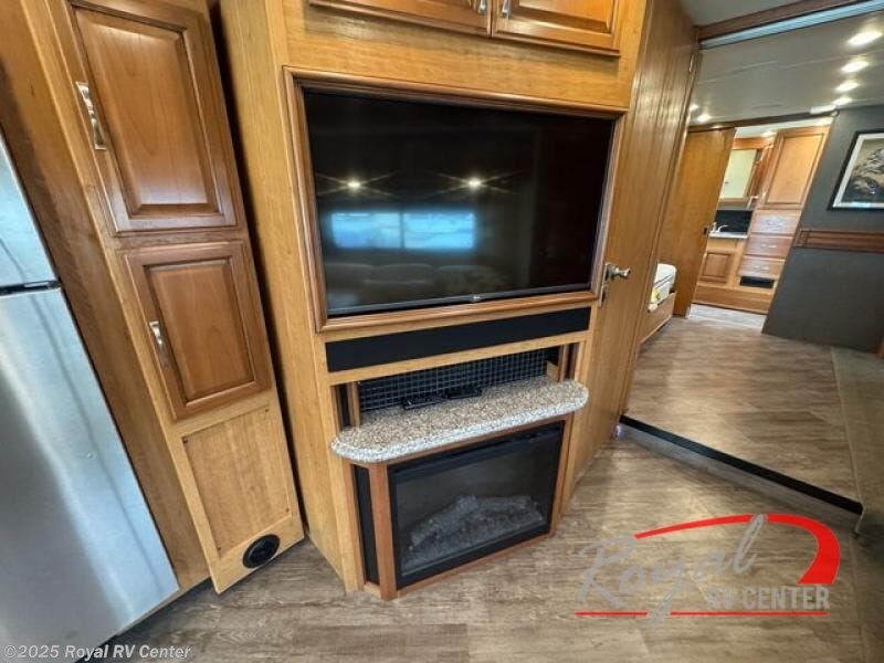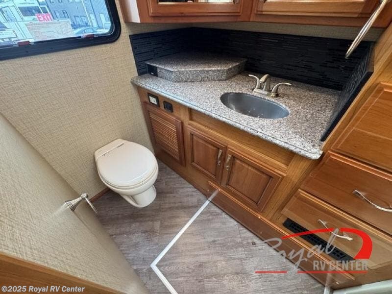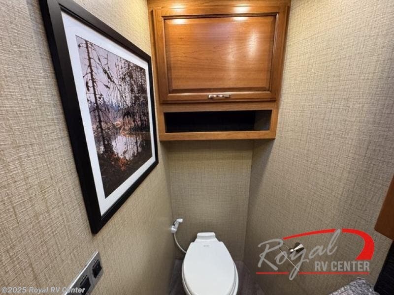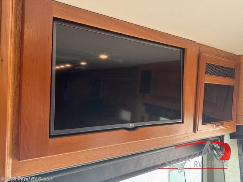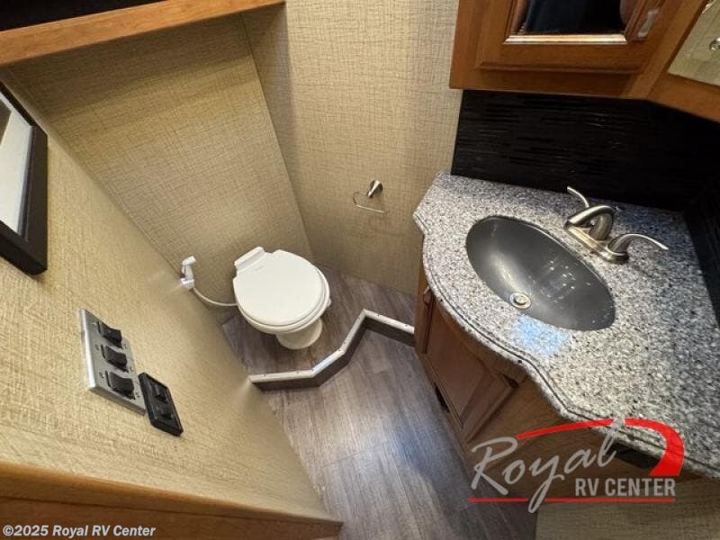 Mid coach you will find a convenient half bath with toilet and sink along the curb side. Just outside the bathroom door along the angled bath wall is a 42" LED TV and fireplace. The perfect addition for evenings when you just want to cozy up inside and enjoy a movie or relaxing time with a bit of ambiance that a fireplace provides.