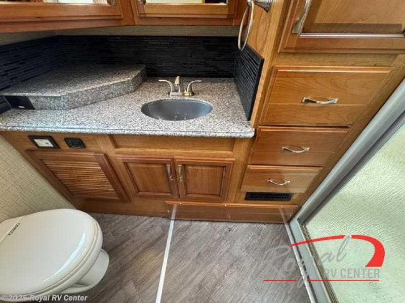The master bath is at the rear of this diesel coach and features a shower with full seat and shelf, a linen cabinet, toilet, and vanity with sink, plus overhead storage.