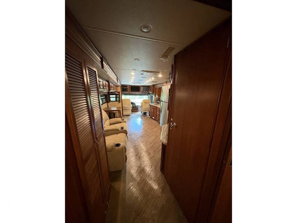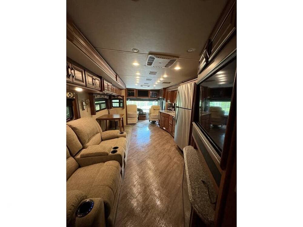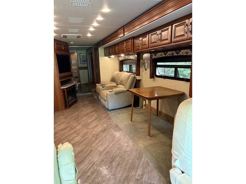 The RV has two leather seats up front that spin around to face the living space area, along with a couch and two recliners. The only sleeping area for this unit is in the rear. RV has a washer and dryer!