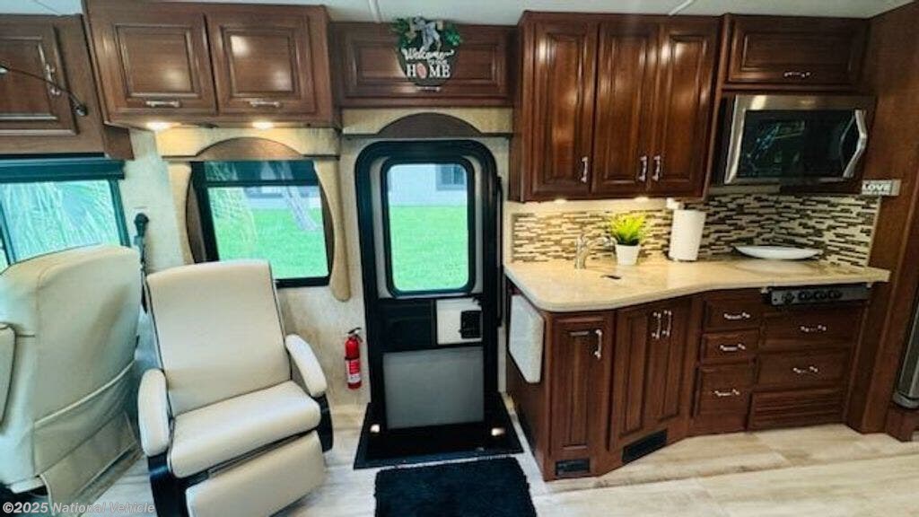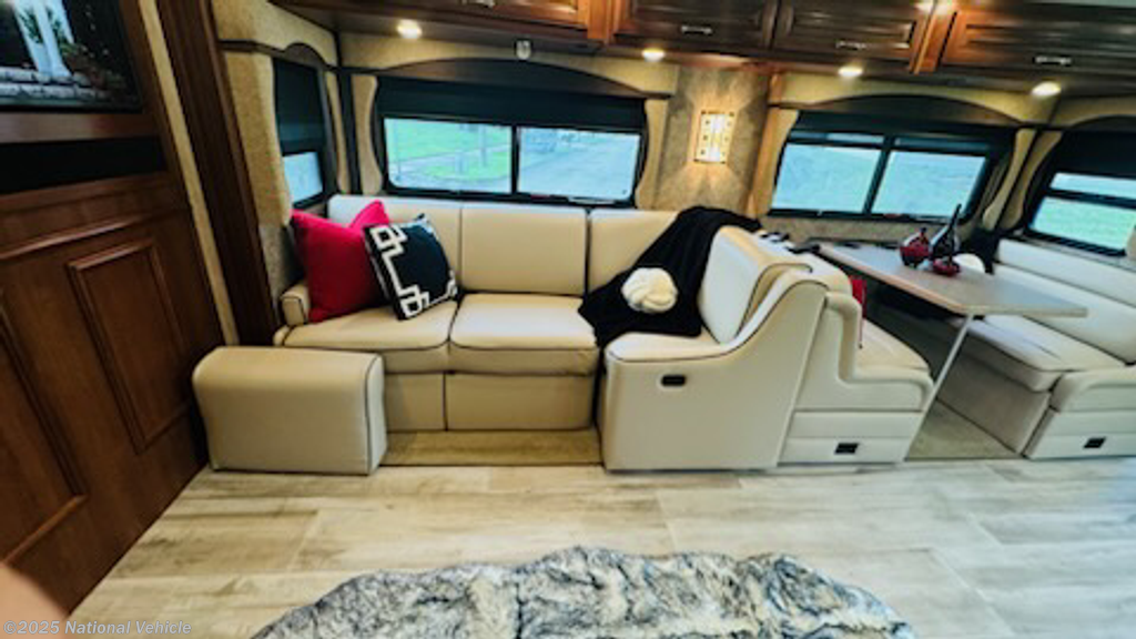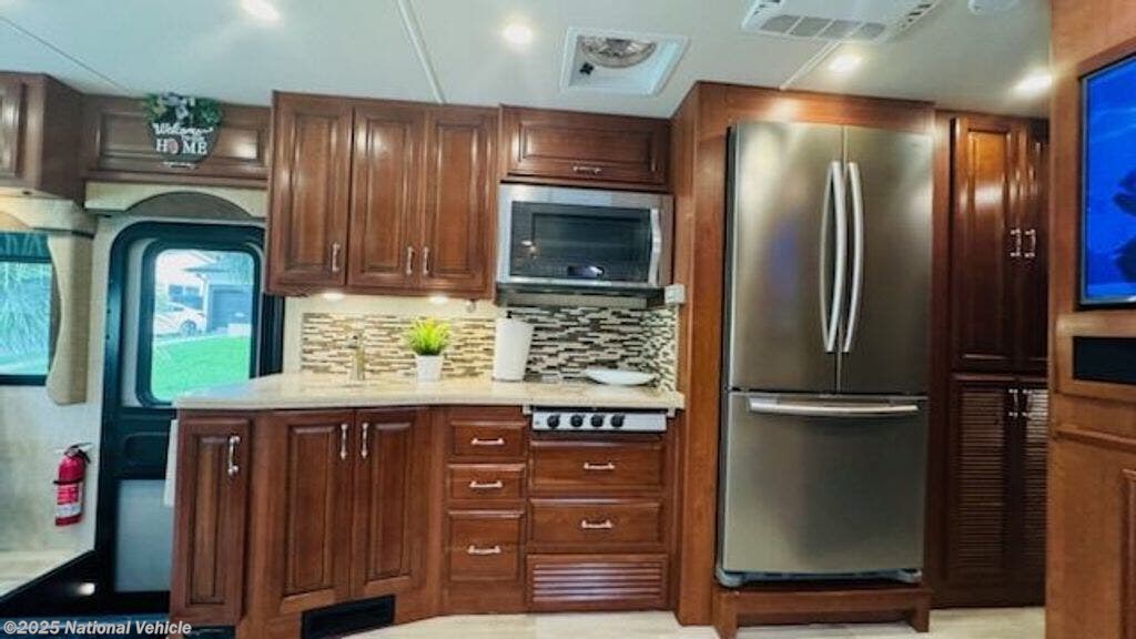 Inside, the spacious multi-slide layout creates an open and inviting living area featuring comfortable seating, a large dinette, and an entertainment center?perfect for relaxing after a day on the road. Large windows and warm interior finishes provide a bright, welcoming atmosphere throughout. The well-equipped kitchen includes solid-surface countertops, a residential-style refrigerator, three-burner cooktop, microwave, and ample cabinetry for effortless meal preparation.