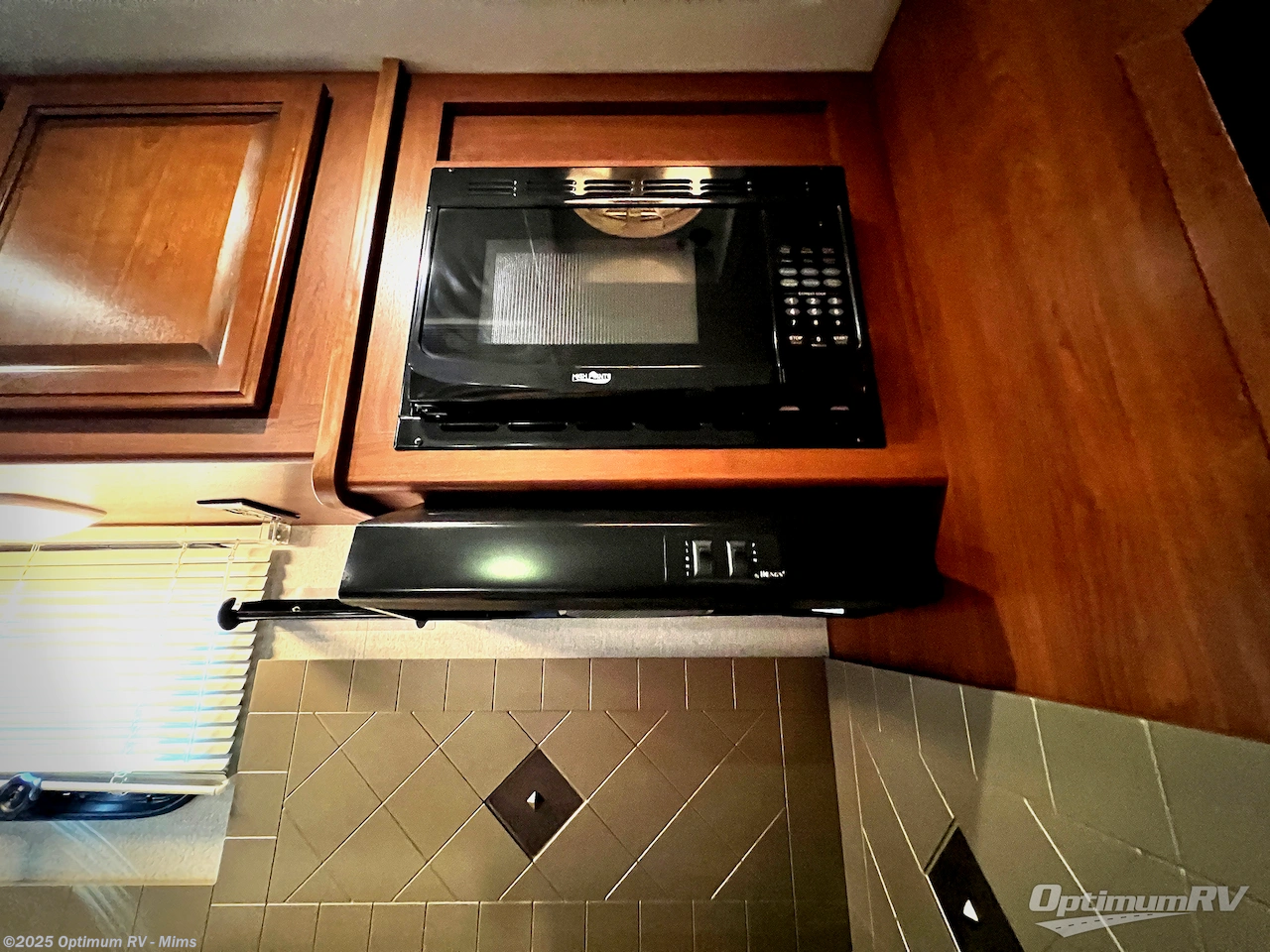 To the left of the door find a double sink, a three burner range with overhead microwave oven, and ample storage for dishes and things.